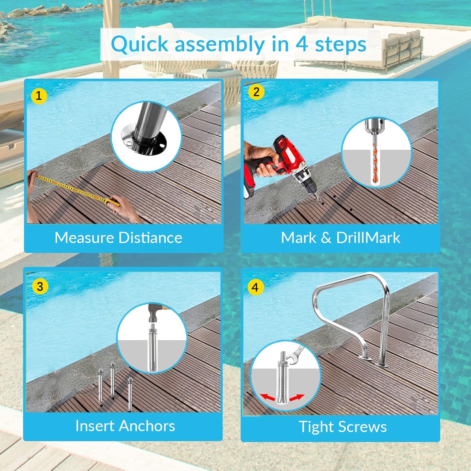 Enhance your pool experience with our premium stainless steel pool grab rail, designed for safety and convenience. Crafted from 100% 304 stainless steel, this durable handrail is resistant to rust and stains, ensuring long-lasting use in both indoor and outdoor environments. Its smooth, polished surface provides a comfortable grip, making entry and exit from your pool effortless and secure.Ideal for a variety of settings, this versatile grab rail is perfect for:★ Private swimming pools★ Public and large swimming pools★ Indoor and outdoor facilities★ Sloped entrances★ Spas and hot tubs★ Water parks and more.Our pool handrail comes complete with all necessary accessories, including screws, anchors, and a railing cover, making installation straightforward and hassle-free. We recommend using a hammer drill for optimal results when securing the handrail to concrete surfaces.Customer satisfaction is our priority. We stand behind the quality of our products and offer a replacement or full refund if you are not completely satisfied. Feel free to reach out with any questions or concerns.For maintenance, simply wipe the handrail with a dry cloth to keep it clean and looking new. Invest in safety and style for your pool with our reliable grab rail today!
