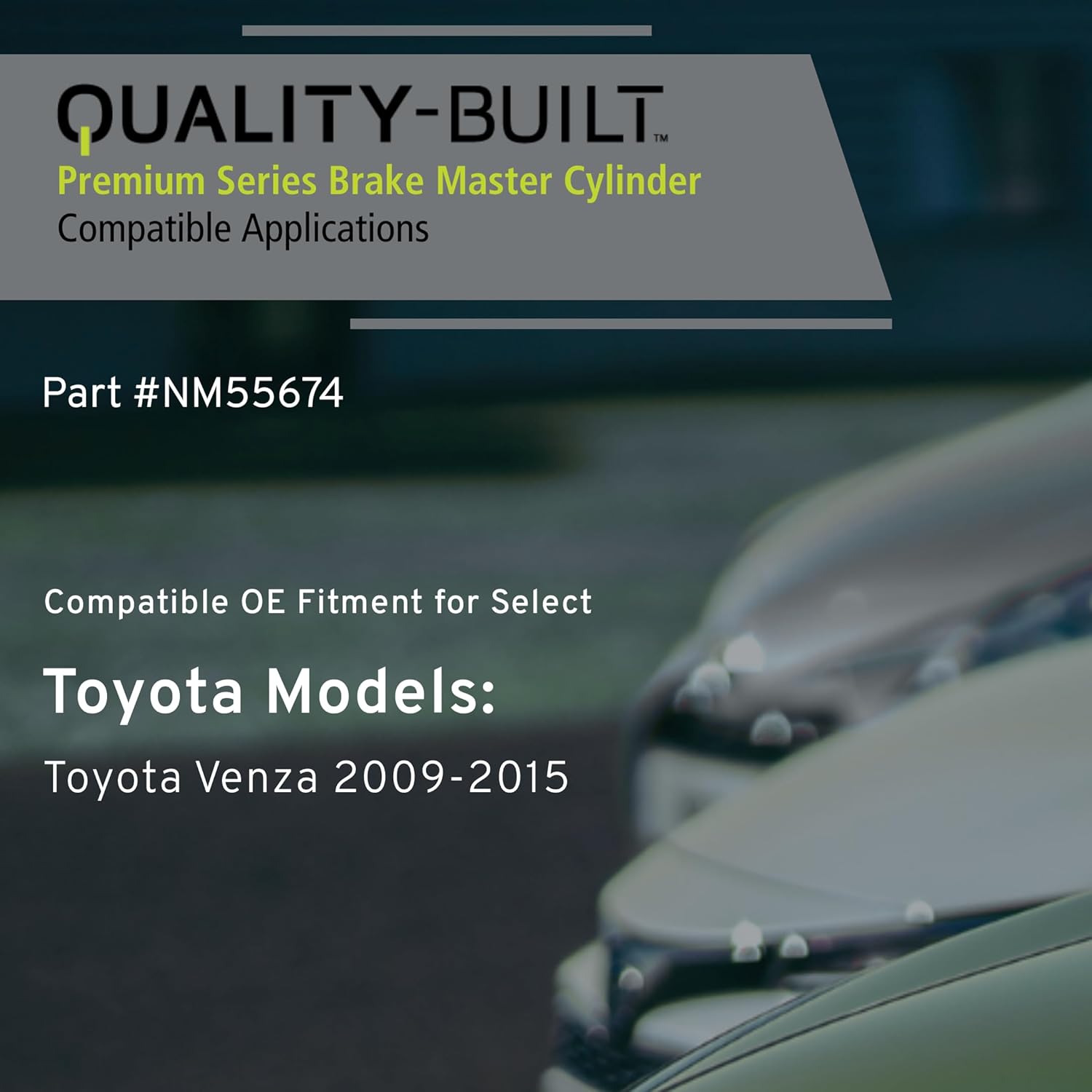 QUALITY-BUILT Premium brake master cylinders are engineered to restore factory brake responsiveness and deliver consistent hydraulic pressure-whether you're navigating city streets or cruising the highway. Ideal for vehicles needing a dependable OE-style replacement, they offer a direct-fit solution to maintain braking integrity. Each unit is manufactured to precise OEM standards using high-quality castings and seals for reliable fluid control, leak resistance, and extended service life. The result? Confident pedal feel, accurate pressure modulation, and smooth, predictable stops in every condition. QUALITY-BUILT Premium master cylinders undergo 100% pressure testing and include factory-style reservoirs where applicable, ensuring proper fluid capacity and fitment right out of the box. Internal components are engineered for durability and consistent output-mile after mile. Designed for easy installation and long-term reliability, QUALITY-BUILT Premium master cylinders are trusted by DIYers and professionals alike. Pair them with QUALITY-BUILT brake components for a complete brake system refresh-built for durability, engineered for peace of mind.PART SPECS: DESC: QUALITY-BUILT Premium Brake Master Cylinder with Reservoir NM55674 - Compatible with 2009-2015 Toyota Venza Master Cylinder Bore Diameter inches: 0.875