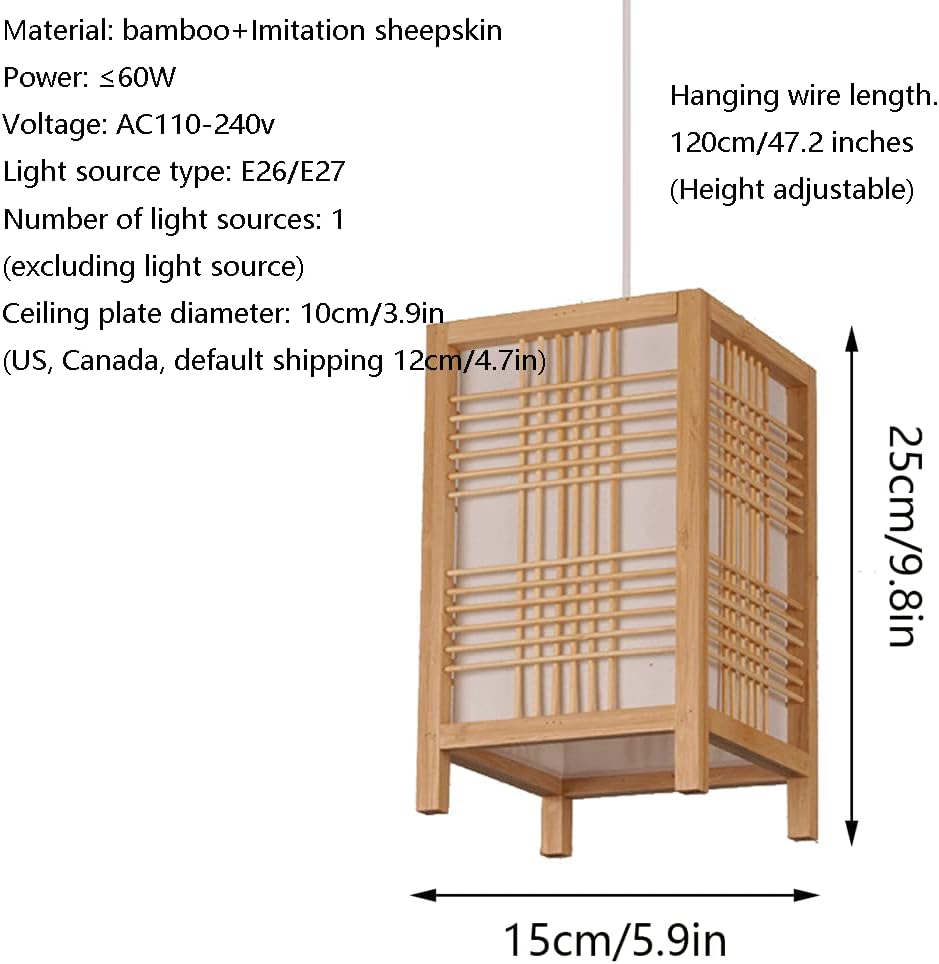 Welcome to our store to take home each artwork lighting.Condition: 100% brand newStyle: vintage styleType: Bamboo and rattan chandelierCraft: hand-wovenMaterial: bamboo + imitation sheepskinColor: natural colorProduct Size.Shade diameter: 15 cm / 5.9 inches, height: 25 cm / 9.8 inchesHanging wire length: 47.2 inches / 120 cm (hanging wire length can be adjusted, if you need other sizes, please fill in the notes or contact us in time)Voltage: 110V~240V (included)Bulb base: E27/E26 (without bulb)Power: 1 ~ 60w (maximum)Bulb type: LED / energy-saving lamps / incandescent lamps (without bulbs)Package includes: bamboo rattan chandelier X1 + accessories package X1 (without bulb)Whether to include the light source: No.Recommended irradiation area: 5-25 square meters (depending on the size)Warm tips:1. Please confirm the size and color before purchase.2. Please allow an error of 1 to 3 cm due to manual measurement.3. Please do not connect or supply power until the light is fully assembled.4. Be careful not to pull the wire when unpacking, it may cause a bad connection.Hope you have a happy shopping experience!