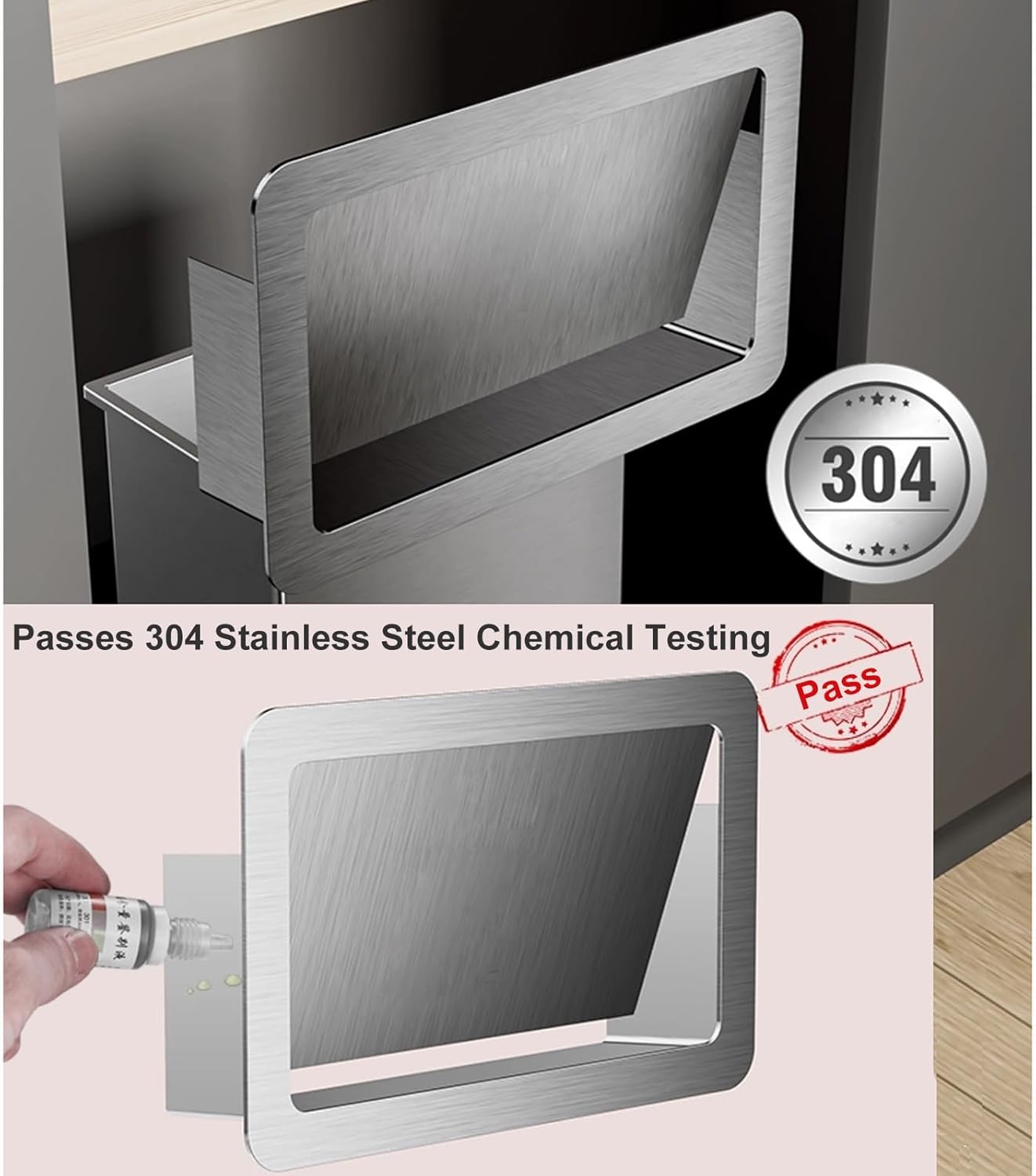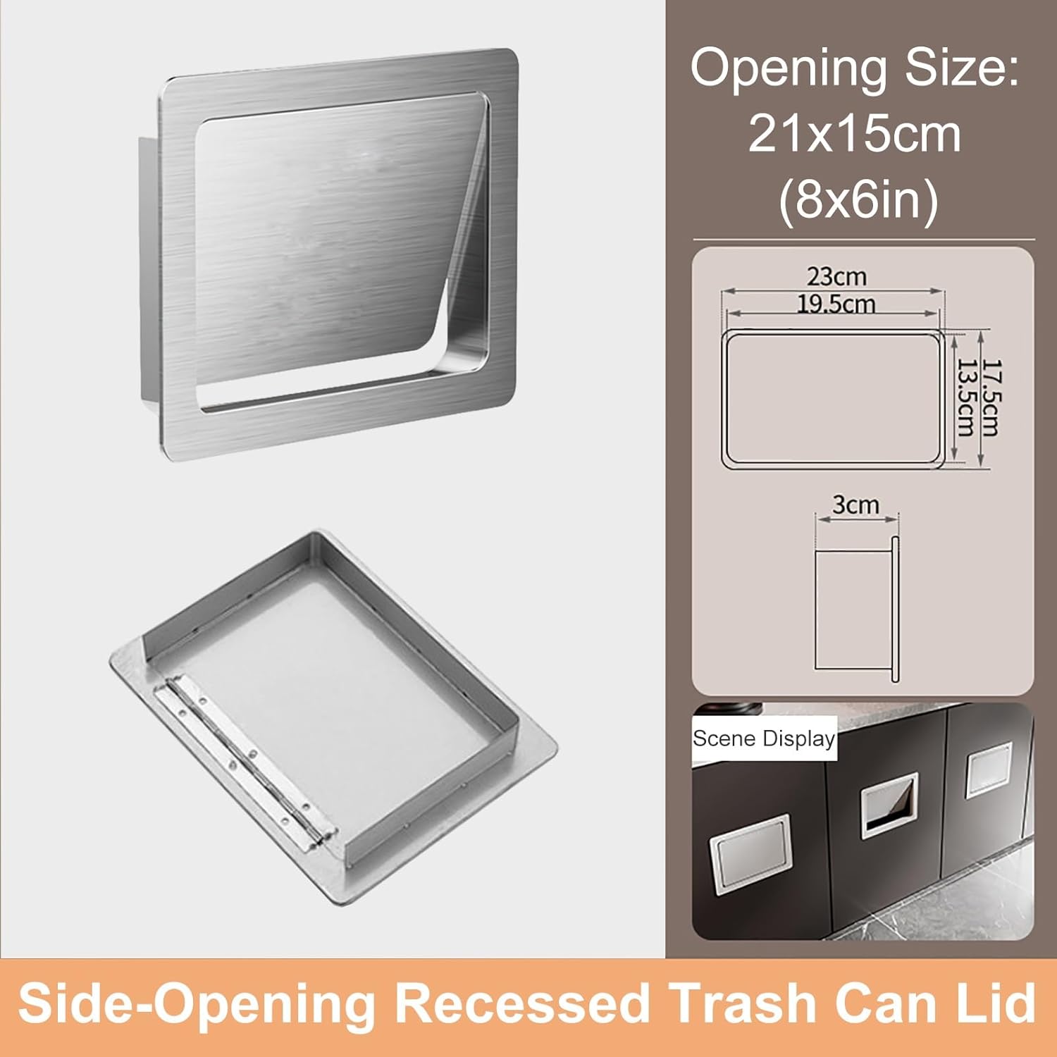 304 Stainless Steel Trash Chute Door, Side Mount Trash Chute with Hinged Inward Flip Panel LidIt is suitable for home, office, hotel, restaurant and any kitchen or bathroom locker.Features:◎ Side-opening, recessed trash can lid, flush-mounted installation, saves space.◎ Automatic closing of the lid, odor sealing.◎ The garbage can cover is made out of 304 stainless steel, it can be tested with 304 material testing solution.◎ The two trash can lids with opening sizes of 8.5x6 inch and 12x7 inch have a slanted chute, allowing trash to slide in automatically.Basic Information:◎ Product name: Recessed Trash Can Lid◎ Material: 304 stainless steel◎ Three Opening Size Options: - Trash can lid size: 23x17.5 cm/9x7 inch, Suggested opening size: 21x15 cm/8x6 inch; - Trash can lid size: 23x17.5 cm/9x7 inch, Suggested opening size: 21.5x16 cm/8.5x6 inch; - Trash can lid size: 33x20.8 cm/13x8 inch, Suggested opening size: 31x18.5 cm/12x7 inch◎ Three Color Options: silver, white, black◎ Installation: Embedded installation to cabinet door/wallInstallation Steps:1. Cut the opening on site2. Insert the trash can lid3. Place your own trash can inside4. Installation completePackage Contents:Trash Can Lid x1