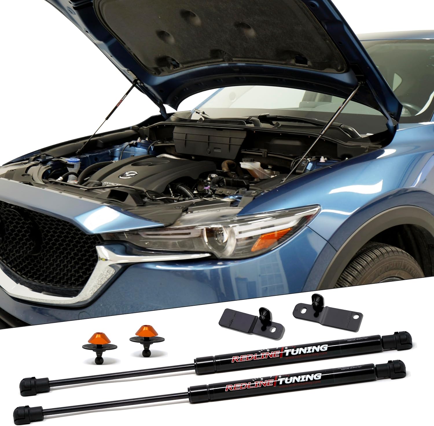 Redline Tuning Hood Quicklift Systems are designed to clean up your engine bay by eliminating the hood prop-rod. The clunky prop-rod is always in the way, but after removing the prop rod and installing a Hood Quicklift System the engine bay is free from obstructions. All Quicklift Systems utilize progressive-rate gas springs that will lift and hold your hood open. Simply start to lift the hood with one hand and it will rise unassisted in a smooth and controlled motion.