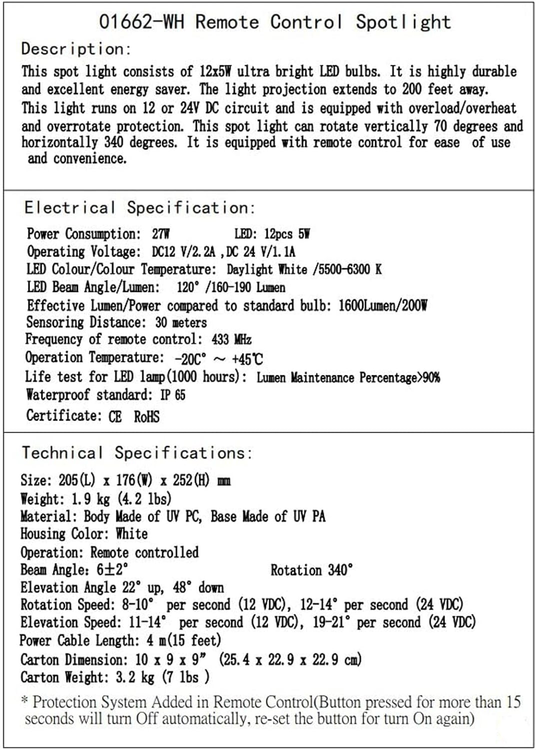 Ultra-Bright 360° Remote Control LED Marine Spotlight Experience superior visibility on the open water or off-road trails. This high-performance LED searchlight delivers 1600 Lumens of piercing white light, giving you the precision and range needed for safe night navigation and rescue operations. Why This Spotlight is the Professional’s Choice: Powerful Long-Range Illumination: Equipped with a high-intensity 27W LED system (1600LM), projecting a focused beam up to 656 feet. Perfect for spotting buoys, dock pilings, or hazards in pitch-black conditions. 360° Omni-Directional Search: Never miss a detail. Features a motorized base with 360° horizontal rotation and 72° vertical tilt, providing comprehensive coverage for multi-angle searching. Long-Range Wireless Control: Operate the light from the comfort of your cabin or cockpit. The included 12V DC remote works from up to 160 feet (50m) away, ensuring seamless adjustments during critical maneuvers. Heavy-Duty Marine Build: Encased in a tough thermoplastic anti-oxidation housing. Designed to withstand high impacts, salt spray, and extreme maritime storms without yellowing or corroding. Simple & Secure Setup: Easy 2-wire installation (Red to Positive/Black to Negative). Includes a vibration-resistant rubber gasket and mounting hardware for a permanent, stable fit on your boat’s deck, truck, or SUV. Technical Specifications: Brightness: 1600 Lumens / 6000K Cool White. Rotation: 360° Horz / 72° Vert. Voltage: 12V-24V Universal (Ideal for Boat/Truck/SUV). Remote Distance: 164ft (50m). Power Cable: 4-Meter (13ft) included. What’s in the Box: 1 x LED Marine Searchlight 1 x Wireless Remote Controller 1 x Protective Rubber Gasket 1 x 4-Meter Connection Cable 1 x Mounting Hardware Set