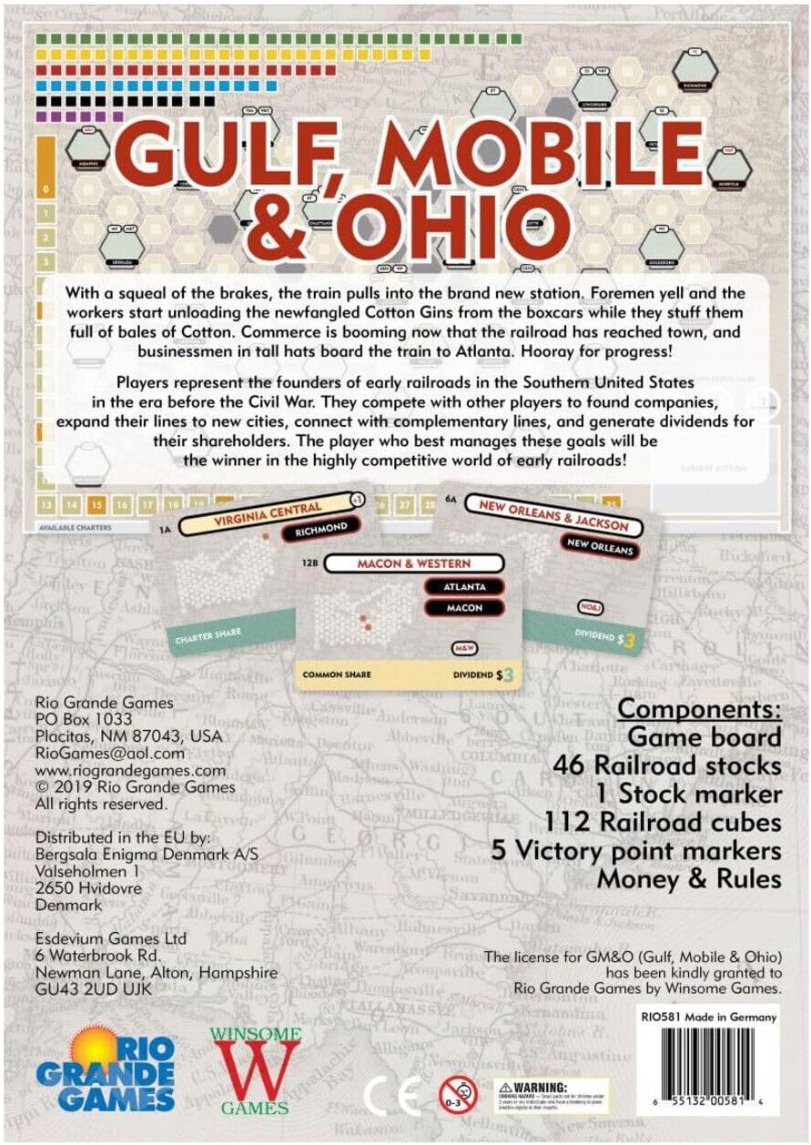 Players represent the founders of early railroads in the Southern United States in the era before the Civil War. They compete with other players to found companies, expand their lines to new cities, connect with complementary lines, and generate dividends for their shareholders. The player who best manages these goals will be the winner in the highly competitive world of early railroads!
