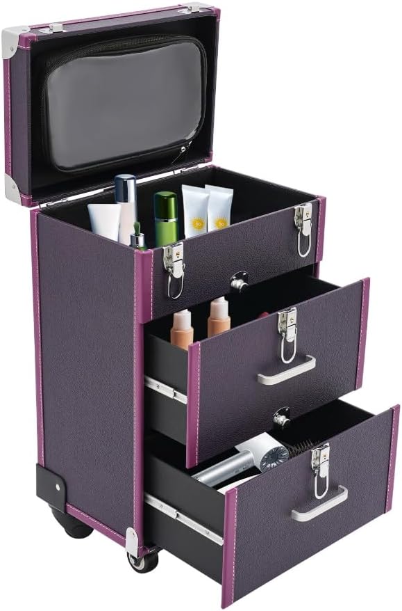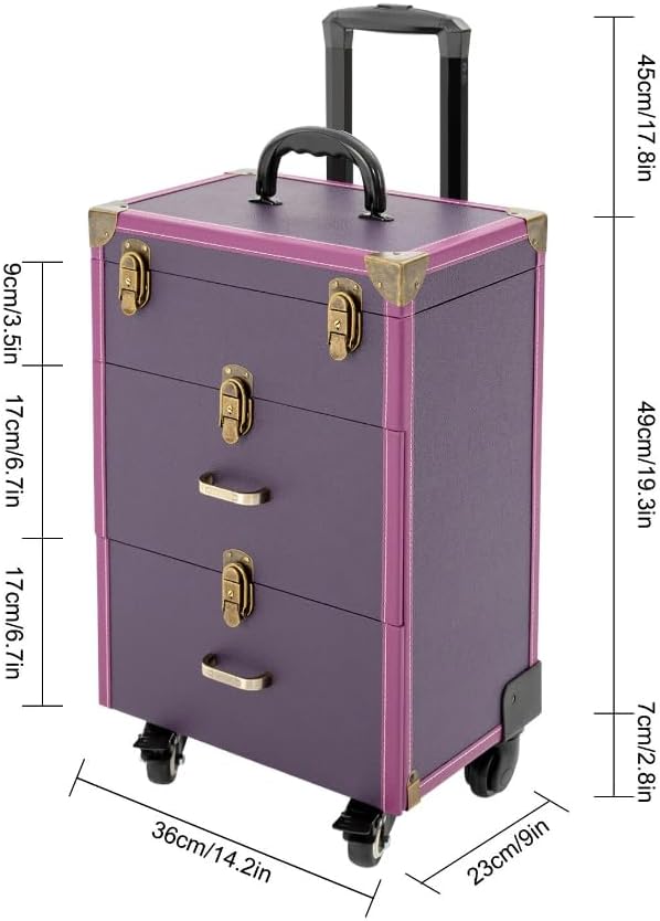 DescriptionIntroducing a rolling makeup train case meticulously designed for professional beauty artists who need to show their makeup artistry anytime, anywhere. Featuring an extra-large main compartment complemented by thoughtfully organized storage sections, this case combines functionality with a sleek, minimalist aesthetic. Paired with smooth-rolling wheels and an ergonomic top handle, it ensures that your daily makeup routine is not only efficient but easily portable.DetailsReinforced Protection Corners: The corners are protected by edging, preventing impact damage and cracking, thereby enhancing the product's robustness and durability.Removable Dividers: The product’s top tier features a series of adaptable compartments, divided by removable dividers that allow you to easily reconfigure the space to suit your specific storage needs—whether you're organizing small accessories, beauty tools, or everyday essentials.ApplicationIt is recommended for make-up artists from beginners to professionals, such as freelance make-up artists, wedding make-up artists, celebrity make-up artists, and make-up interns. It can also be used for traveling or kept at home for makeup enthusiasts, hair barbers/stylists, nail technicians, estheticians, embroiderers, and crafters.SpecificationsColor: Black, BronzeStyle: ModernShape: RectangularMaterial: PU, IronProcess: Adhesive Bonding and SewingNumber of Layers: 3Number of Drawers: 2Assembly Required: NoMounting Type: Floor StandingNumber of Wheels: 4(Front Wheels with Brakes)Telescopic Rod Length (Max.): 45cm/17.8inCase Size: 36*23 *49cm/14.2*9*19.3inWheel Height: 7cm/2.8inTier Height: 9cm/3.5in, 17cm/6.7in, 17cm/6.7inEach Upper Compartment Size: 3.5*3.5cm/1.4*1.4inDiagonal Length of Upper Layer: 40cm/15.7inMiddle Layer Inside Size: 30*19.5*13.5cm/11.8*7.7*5.3inDiagonal Length of Middle Layer: 38cm/15inEach Bottom Layer Compartment Size: 14.5*19*13.5cm/5.7*7.5*5.3inDiagonal Length of Each Bottom Compartment: 22cm/8.7inGross Weight: 8.3kg/18.3 lbsNet Weight: 7.89kg/17.4 lbsPackage Size: 64*42*33cm/25.2*16.54*12.99 inPackage Included1* Rolling Makeup Train Case2* Keys