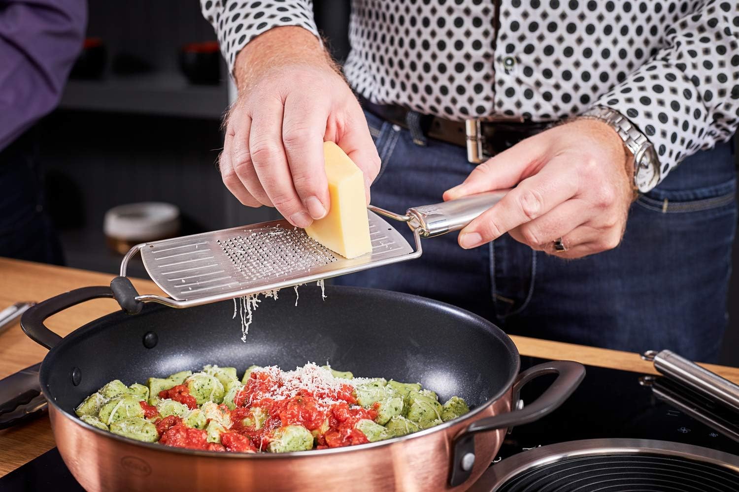 Noble grater with elegant design and best performance. Completely made of stainless steel, the new ergonomic handle is the perfect complement to the acid-etched incisors of the grater, which ensure powerless grating with the best grating results. The concave shape centres the material to be grated, the run-in and run-out surfaces make it easier to apply the material and optimise the grating process. The silicone base allows non-slip working in any position. The grater can also be used directly above a bowl. The fine grater is ideal for the finest Parmesan, chocolate, ginger or aromatic cinnamon sticks. Including protective cover.