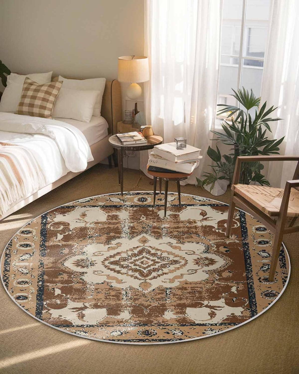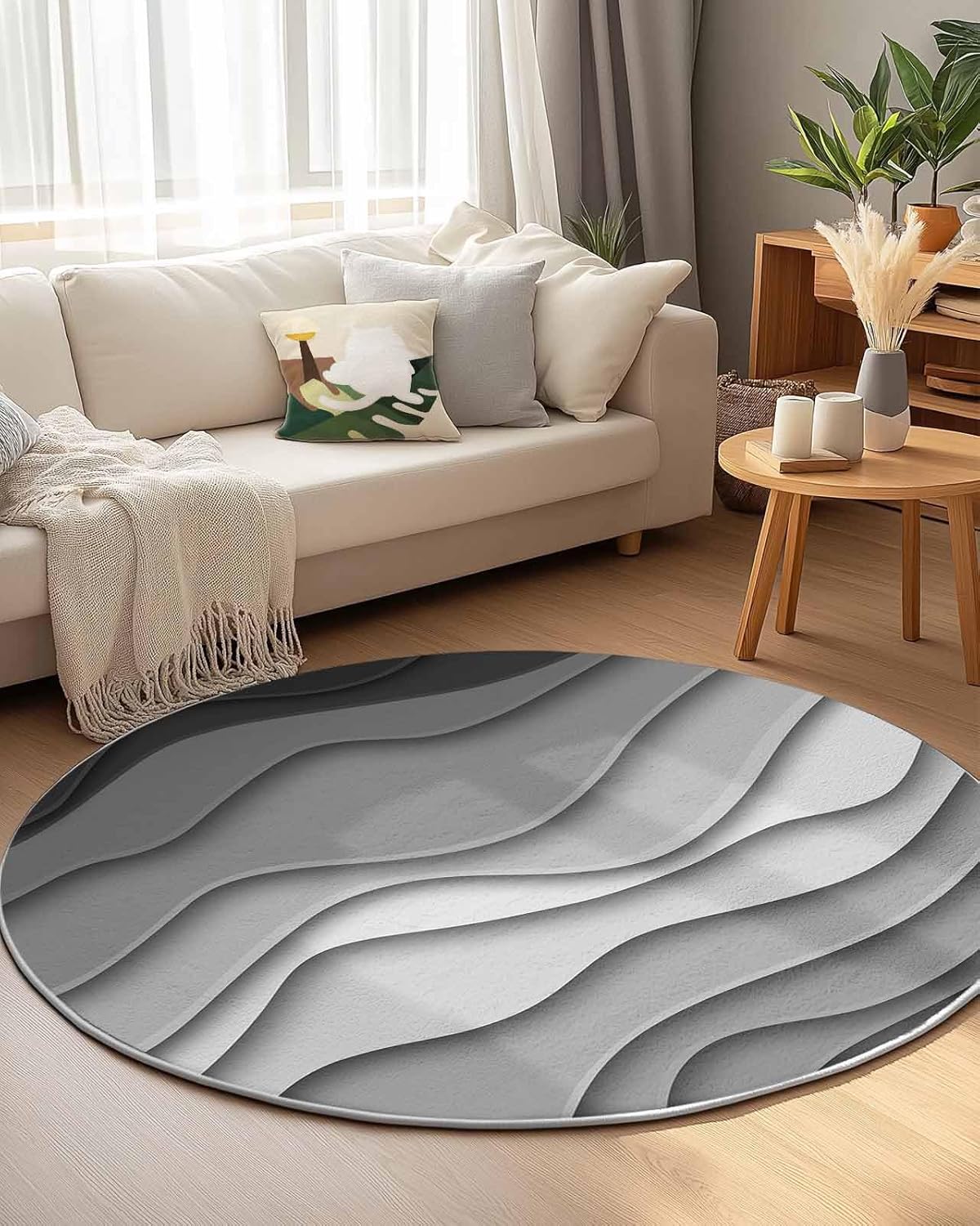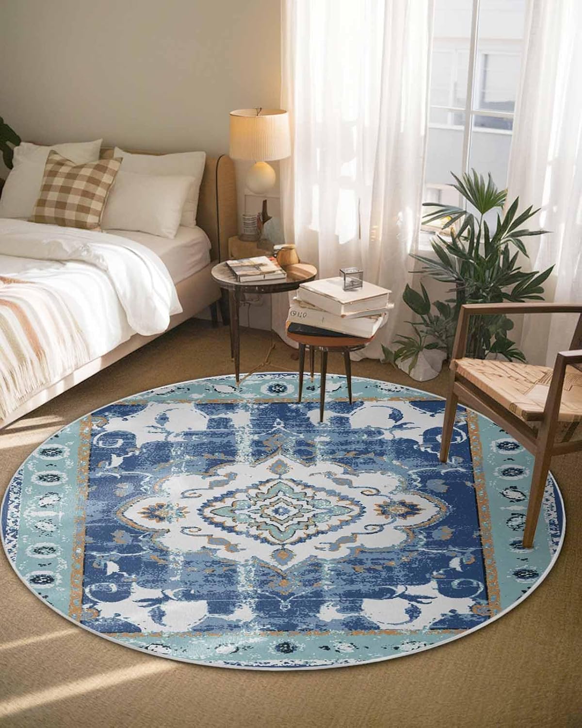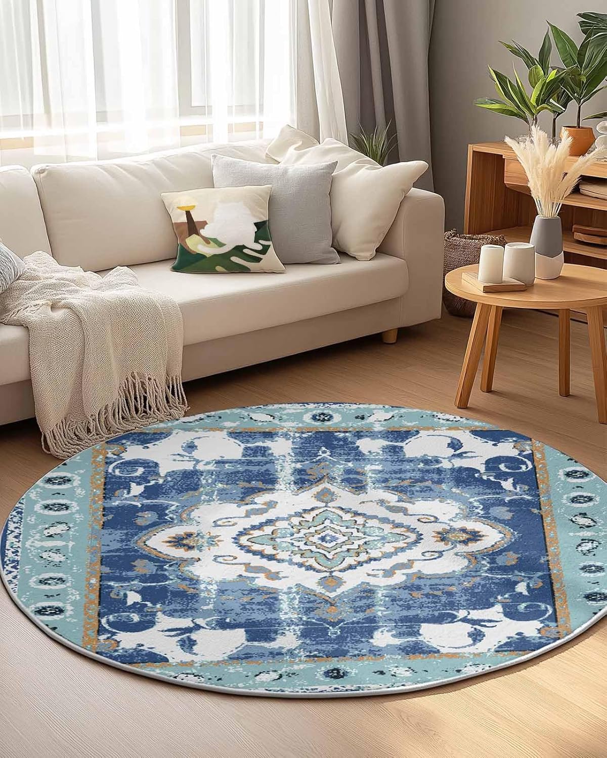 Our round area rug is designed to blend seamlessly with any room decoration, from modern style to traditional style. Our versatile and stylish rug that is sure to become a long-term favorite in your home or workplace, elevate the look and feel of your space.Soft TextureIndoor carpet is made of premium fine belgian velvet, our circle rug has a soft and cozy surface that your feet will love sinking into, creating a warm and inviting atmosphere.Non-slip Rubber BottomThe durable rubber bottom hugs the ground, keeping the rug where you want it, allowing childrens, pets and the elderly to walk safely.Convenient Foldable FeatureNon-slip rug flexible belgian velvet material is easy to fold, convenient storage or transport to different rooms when not in use.Multi-Room AdaptabilityFrom a cozy living room sofa to a quiet bedroom, a practical dressing table, a casual vacation home, a fun kids room, a welcoming guest room, a simple dorm to a professional office, our round area rug is versatile.