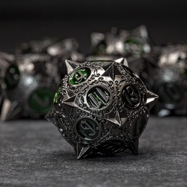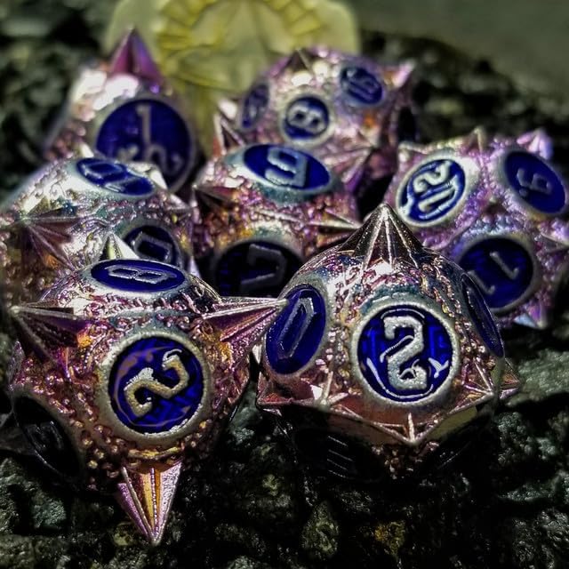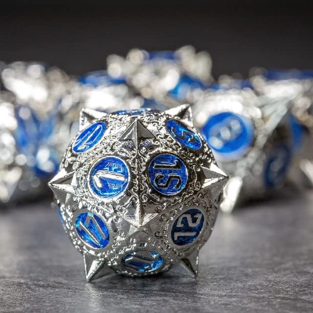 Equip yourself with Sage’s Enchanted Morningstar to pummel your enemies!This exquisite metal 7-dice set features sharp spiked metal design with ornamented corners and borders, and are oversized making them feel balanced, heavy, and solid. Great for most tabletop RPG games such as Dungeons and Dragons, Pathfinder, and Shadowrun Set includes one D20, D12, D10, D00, D8, D6, and D4 Material: zinc alloy Color/style: ornamental spiked Morningstar design with various colors. WARNING: the dice are heavy with metal spikes – usage of a dice mat is highly recommended. Dropping the dice on surfaces or limbs, and stepping on the dice may cause damage. Not suitable for children Oversized design for exceptional feel and functionality. Includes complementary Sage’s Portal tin box.
