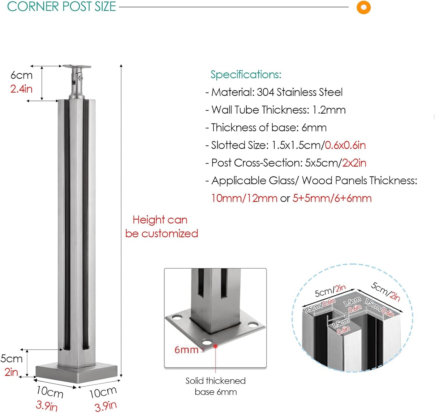 Stair Railing Handrail:If you're looking to enhance the aesthetic appeal and safety of your outdoor space, our premium glass balustrade posts are the ideal choice. Perfect for decks, patios, balconies, and gardens, these posts allow you to maintain an unobstructed view while ensuring a secure environment. Crafted from durable 304 stainless steel, these posts are designed to withstand various weather conditions, making them suitable for both residential and commercial settings. With a customizable height ranging from 65cm (25.5in) to 145cm (57in), our balustrade posts accommodate a variety of panel thicknesses, including glass, wood, plastic, or acrylic. This versatility ensures you can achieve the desired look for your space. The posts are easy to install and provide sturdy support, giving you peace of mind whether in a wet or dry environment. Key features of our glass balustrade posts include: - Compatibility with 10-12mm (0.4-0.5in) and 5+5mm/6+6mm panels, making them adaptable for different styles. - Compliance with residential and commercial building codes for safety. - A sleek square design that enhances the modern aesthetic of any outdoor area. Each package includes one glass balustrade post, one base cover, and two adhesive strips for easy installation. When setting up your railing, remember that the recommended spacing between posts is 1-1.2m (3.3-3.9ft) for optimal safety and stability. To ensure the longevity of the stainless steel, it is advisable to avoid locations within 10 miles of the seaside or saltwater. Transform your outdoor space into a stylish and secure retreat with our glass balustrade posts, providing both functionality and elegance.