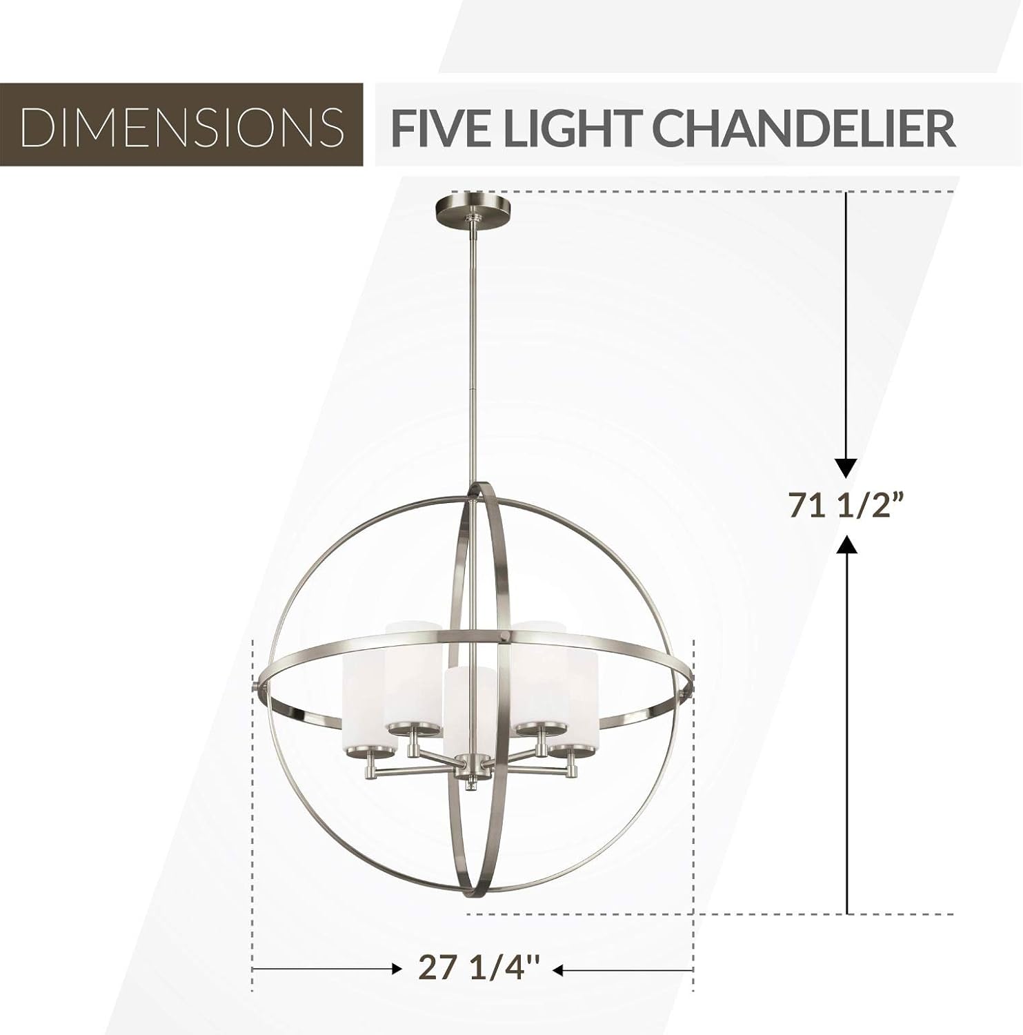 The Sea Gull Lighting Alturas five light single tier chandelier in brushed nickel enhances the beauty of your home with ample light and style to match today's trends. The silhouette of the modern Alturas lighting collection by Sea Gull Lighting features an interlocking, spherical steel frame, which harkens back to the Unisphere constructed for the 1964 New York World's Fair. The minimalist Alturas Collection draws the eye to the soft, warm glow of the light emitted from the cylindrical Satin Etched glass shades. The full assortment includes three-, five- and nine-light chandeliers, a one-light mini pendant, a three-light pendant, a two-light semi flush which is convertible into a pendant, and one-,two-, three- and four-light bath fixtures. All fixtures are offered in Brushed Nickel and Satin Bronze finishes, the bath fixtures are also offered in Chrome finish. Incandescent and ENERGY STAR-qualified LED lamping are available.