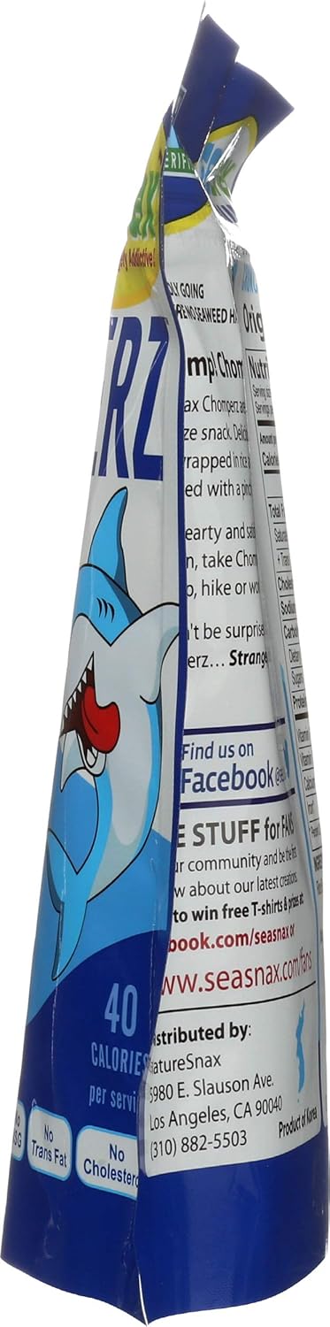 CHOMPERZ Crunchy Seaweed ChipsBoldly going where no seaweed has gone beforeChomp! Chomp!SeaSnax Chomperz are the perfect bite-size snack. Delicious seaweed curls wrapped in rice and lightly seasoned with a pinch of sea salt. More hearty and satisfying than popcorn, take Chomperz on your next trip, hike or work-out.But don't be surprised if you find Chomperz... Strangely Addictive!Ingredients: Seaweed, Glutinous Rice Flour, Rice Bran Oil, Tapioca Starch, Sea Salt, OnionNet Wt. 1oz (30g). 8 bags per caseContains tree nuts (coconut). Made on equipment that also processes wheat.