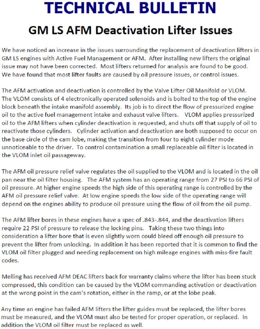 Set of (8) Chevy GMC 5.3 5.3L 6.0 6.0L Active Fuel Management AFM from Elgin Industries. These are Replacement AFM lifters ONLY! Engine Requires (8) Standard roller lifters for whole set for engine. NOTE: AFM lifters fail due to a faulty VLOM (valley cover) - Updated VLOM# 12571609 from GM must be installed with new lifter to prevent future failures and warranty coverage.