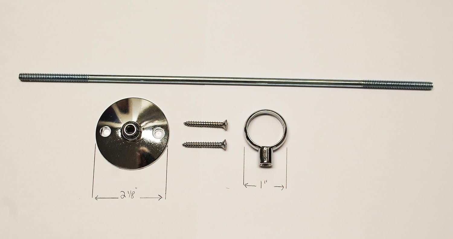 Ceiling Support Rod for up to a 1 inch shower rod, Polished Chrome Finish Quality Rod made of solid brass so it will never rust. 36" long. Comes with 36" rod, ceiling flange, eyeloop, and screws.