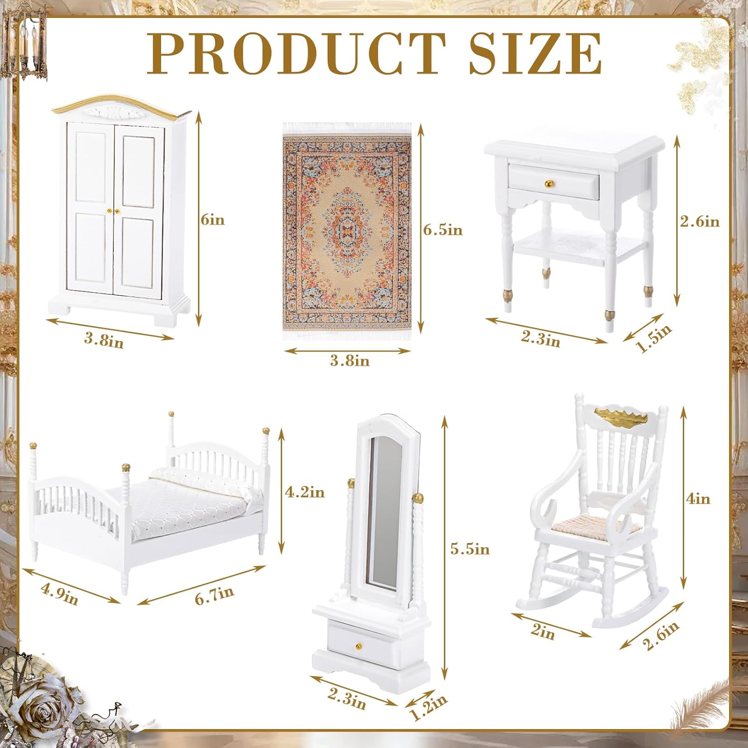 Features: Picture yourself savoring a relaxed afternoon in the rocking chair or enjoying a delightful dress-up session before a glamorous soiree. It's truly an extraordinary and unforgettable present The distinctive Brewster spindle shape adorns the bedposts, rocking chair, and full-length mirror, adding an authentic touch of historical charm. You can also hone your hands on skills, sharpen your focus, and cultivate patience Specifications: Material: wooden Color: white, gold Size: 1: 12 scale Package includes: 1 x Bed 1 x Full length mirror 1 x Rocking chair 2 x Nightstands 1 x Armoire 1 x Rug Notes: Manual measurement, please allow slight errors on size. The color may exist a slight difference due to different screen displays.