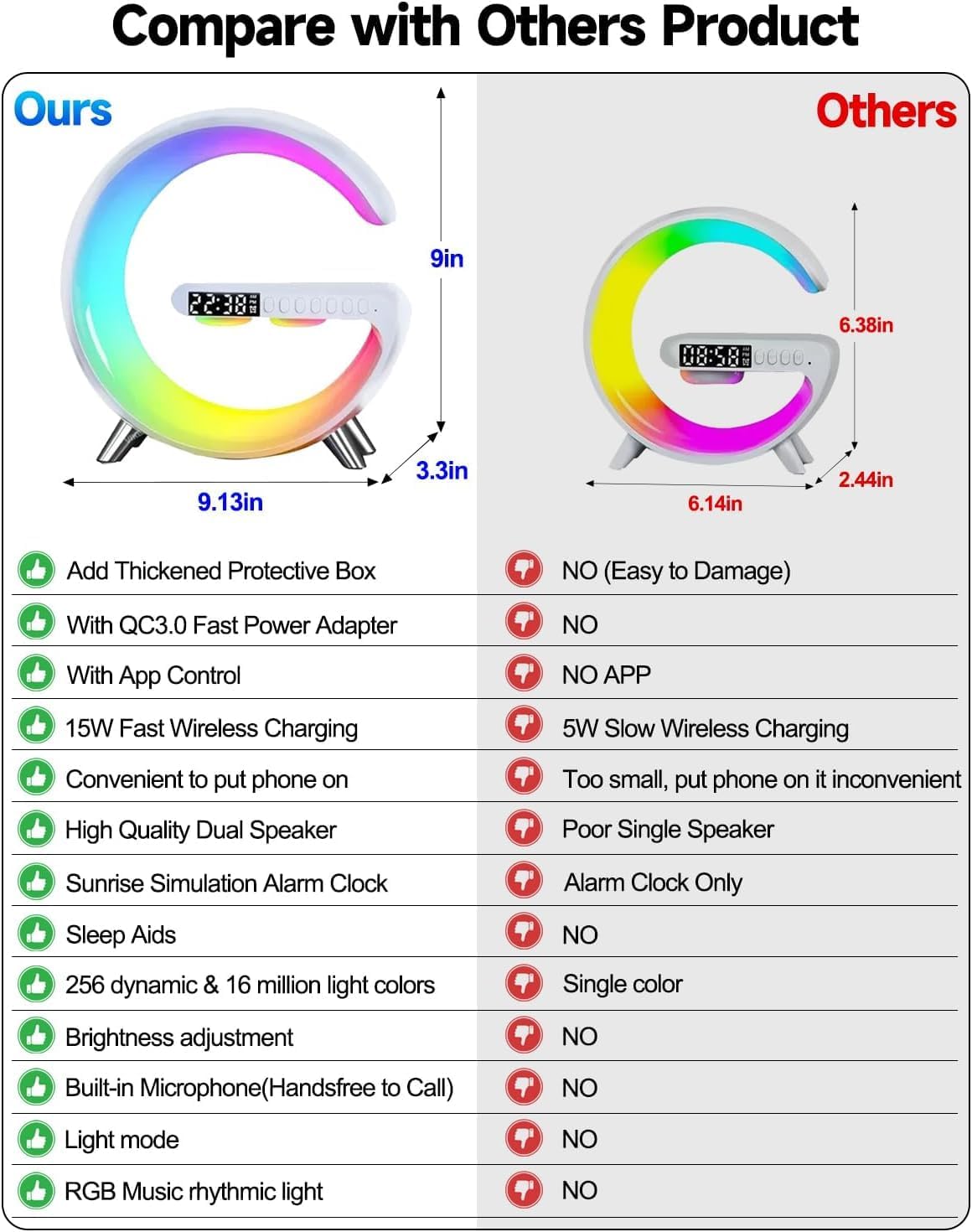 | Additional Features | 15W Fast Wireless Charging, Bluetooth wireless speaker; Handsfree to Call, Decorative Design; APP Controlled, Sleep Aids, Sunrise Alarm Clock |