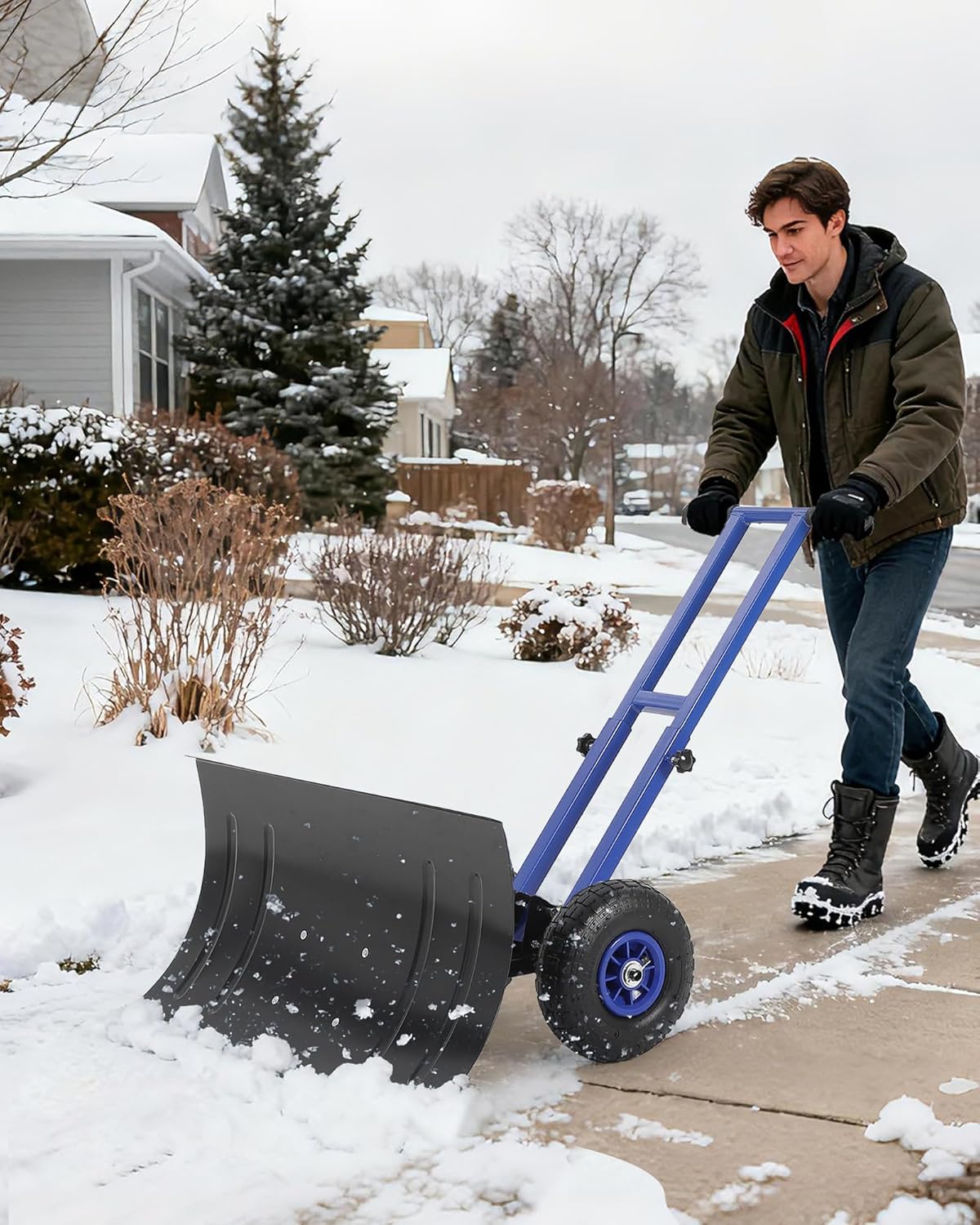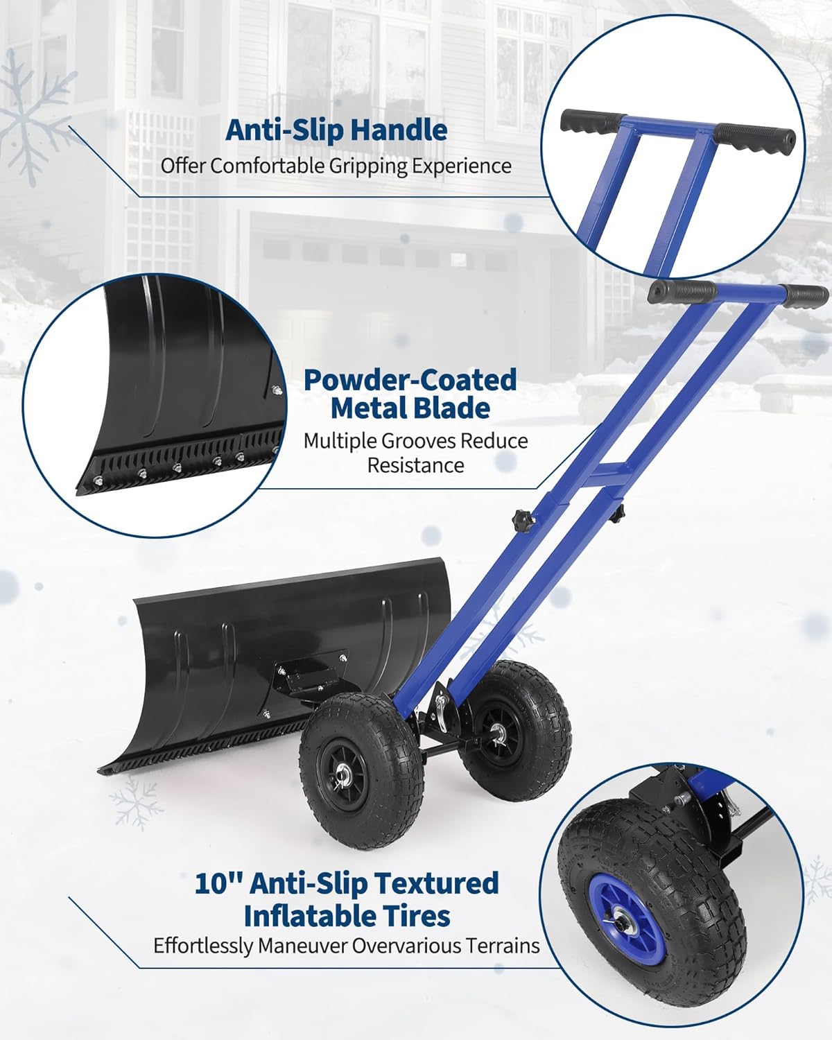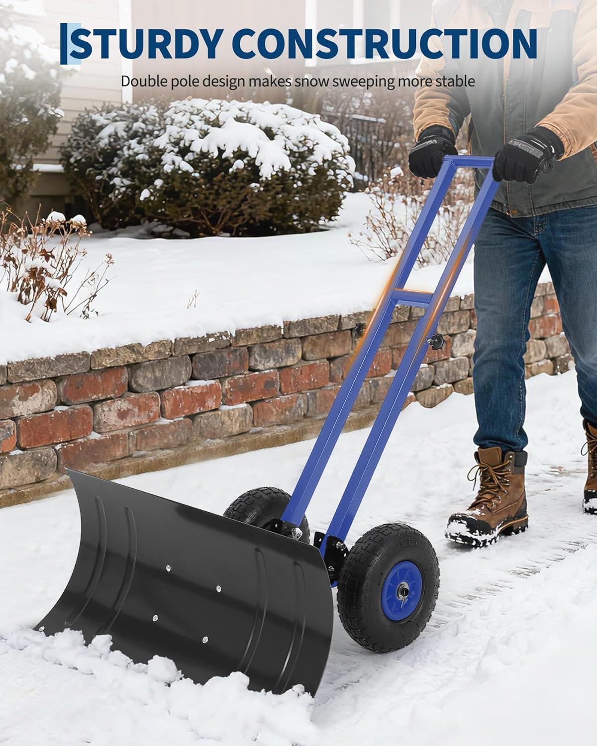 Tired of struggling with heavy snow? Discover how this wheeled snow shovel with an adjustable handle and metal blade makes clearing driveways and sidewalks faster, easier, and a whole lot less exhausting.Highlights at a Glance:- 3 height settings and 5 adjustable angles for comfortable use by anyone- Wide metal blade with multiple angle options clears snow quickly and easily- Textured pneumatic wheels provide strong grip and move smoothly over any terrain- Double pole design and anti-slip handle offer added control and safety- Perfect for driveways, sidewalks, yards, and commercial properties- Simple assembly with clear instructions and labeled partsSpecification:Product Name: Snow Shovel with WheelsBlade Dimensions: 29" W ×14" H / 29" W ×16.5" H / 29" W ×19.8" HColor: Blue / Yellow / Black / RedMaterial: Carbon SteelFriendly Note:Please review the instruction manual before assembly for best results.Tighten all screws and connections securely, but avoid over-tightening.Use slow, steady movements and adjust the blade angle as needed to suit different surfaces.Be mindful of obstacles hidden under the snow, such as rocks or debris, to avoid damage to the blade or wheels.Packing List:1 x Snow Shovel with Wheels1 x Hardware Pack1 x Assembly Instruction