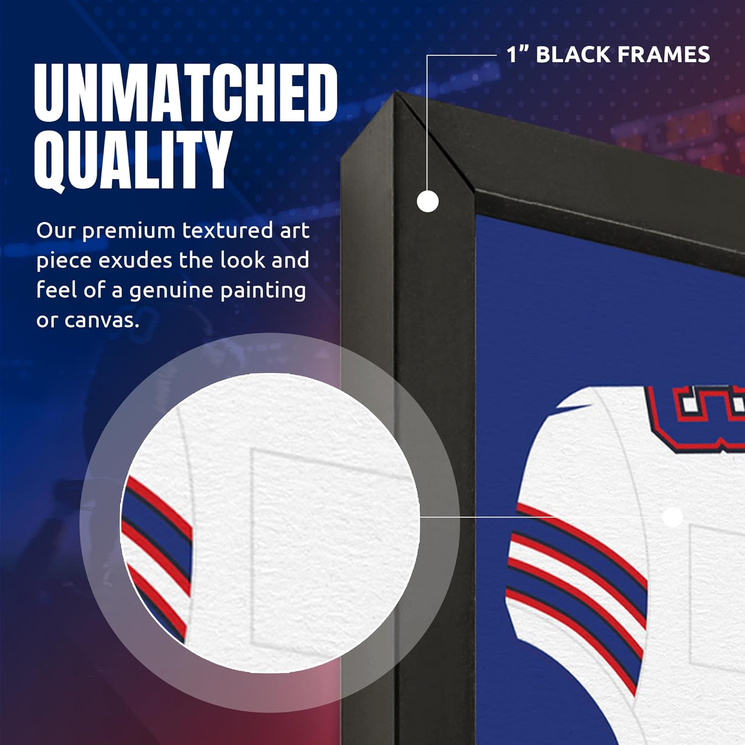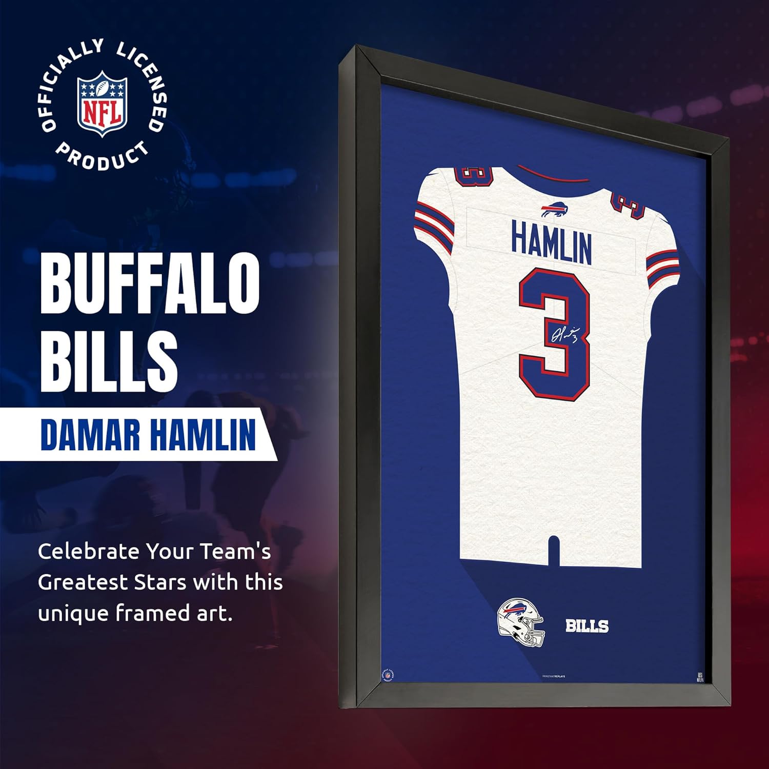 Embrace the essence of NFL fandom with our Buffalo Bills - Damar Hamlin Framed Jersey Print. This classic piece seamlessly blends sports passion with sophisticated decor. The professionally framed jersey print captures the iconic design of Damar Hamlin's jersey, making it a timeless addition to any football enthusiast's collection. Versatile Decor for Fans: Whether you're a die-hard Buffalo Bills supporter or seeking the perfect gift for a football enthusiast, this framed wall art fits the bill. Its versatile design seamlessly integrates into various decor styles, making it a must-have for any NFL fan. Durable Construction, Timeless Display: Built to last, the frame is crafted from high-quality materials to ensure longevity and protection for your cherished piece. This framed jersey print serves as both a tribute to Damar Hamlin and a timeless display of your passion for the Buffalo Bills. Ready-to-Hang: Hassle-free installation! The framed jersey print comes ready to hang, so you can quickly and easily display it in your home, office, or fan cave. No need to spend time and effort on framing – it's all done for you. Official Houston Texans Tribute: Flaunt your steadfast allegiance to the Buffalo Bills with our Damar Hamlin Framed Jersey Print Wall Art, officially licensed and authenticated by the NFL. Infuse a touch of sophistication into your space through the sleek framing, turning your wall into a distinguished gallery of NFL excellence. More than a mere display, this framed collectible serves as an authentic testament to your unwavering dedication to both the sport and your beloved team. Elevate your fan experience with this genuine expression of Buffalo Bills pride.