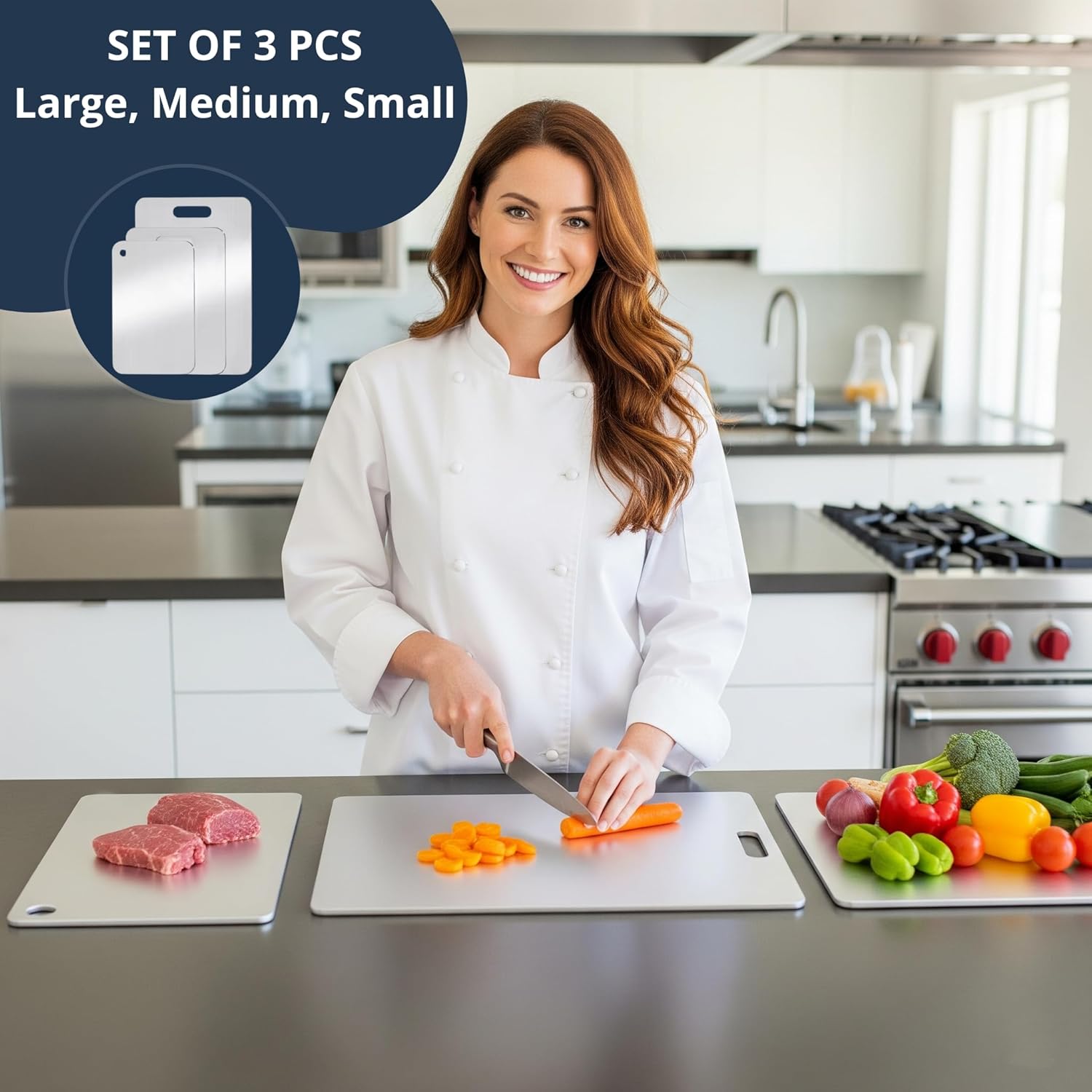 Experience the durability and elegance of our 3-piece stainless steel cutting board set, designed for modern kitchens. Made with premium 304 stainless steel, these boards are non-stick, stain-resistant, and perfect for slicing meat, vegetables, fruit, cheese, and more. Each board comes in three convenient sizes to suit different tasks and is easy to clean by hand or in the dishwasher. These cutting boards maintain a sleek surface that ensures precise and safe cutting. Add a professional-grade, food-safe solution to your kitchen prep routine with this versatile and stylish stainless steel cutting board set.