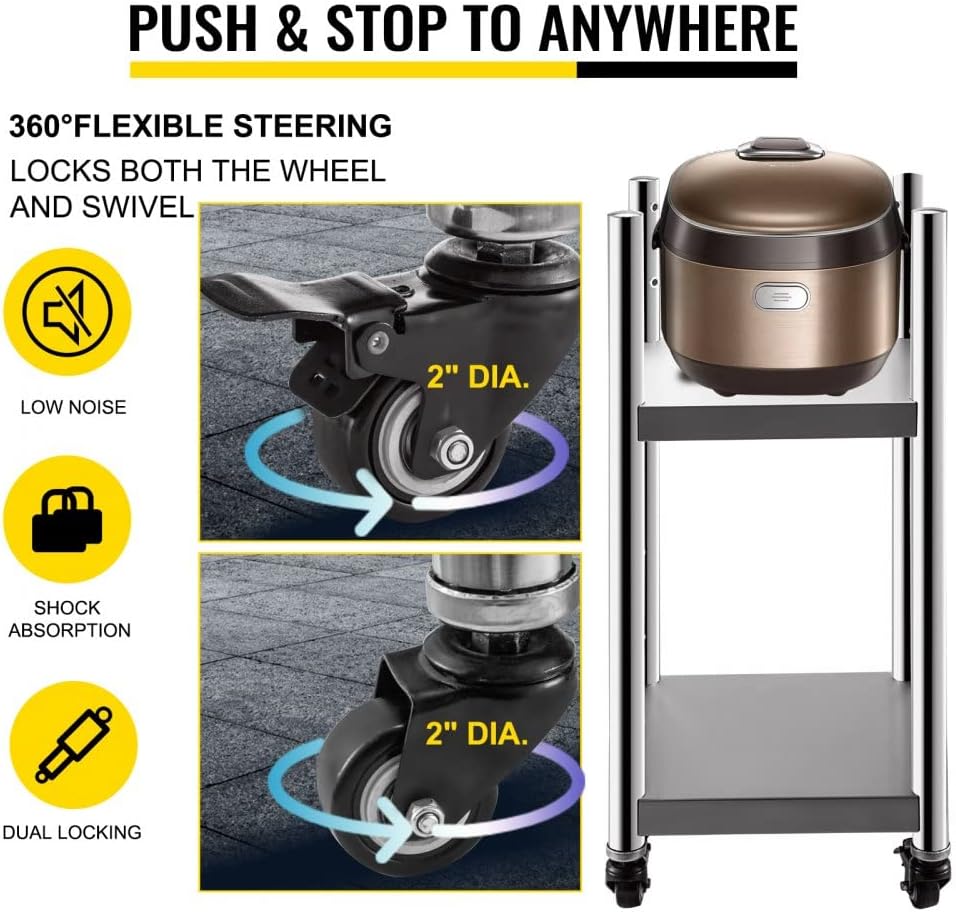 Introducing the Rice Warmer StandKeep your rice warm and ready for serving with our durable and elegant Rice Warmer Stand. Made of premium stainless steel, this stand adds extra strength and stability to your commercial kitchen.Flexible Wheels and Adjustable Heights for Your ConvenienceEasily move the stand around your kitchen with 360-degree rotating wheels and two brakes. The stainless steel shelf is also adjustable in height, allowing you to customize it to fit your rice cooker.Large Capacity and Easy Installation for Your Peace of MindWith a capacity of 330lbs and easy installation, our Rice Warmer Stand is perfect for busy kitchens. It accommodates rice cookers within 15.5 inches and comes with a step-by-step installation guide. The all-stainless steel structure is easy to clean as well. Get your Rice Warmer Stand today and enjoy perfectly warm rice every time!