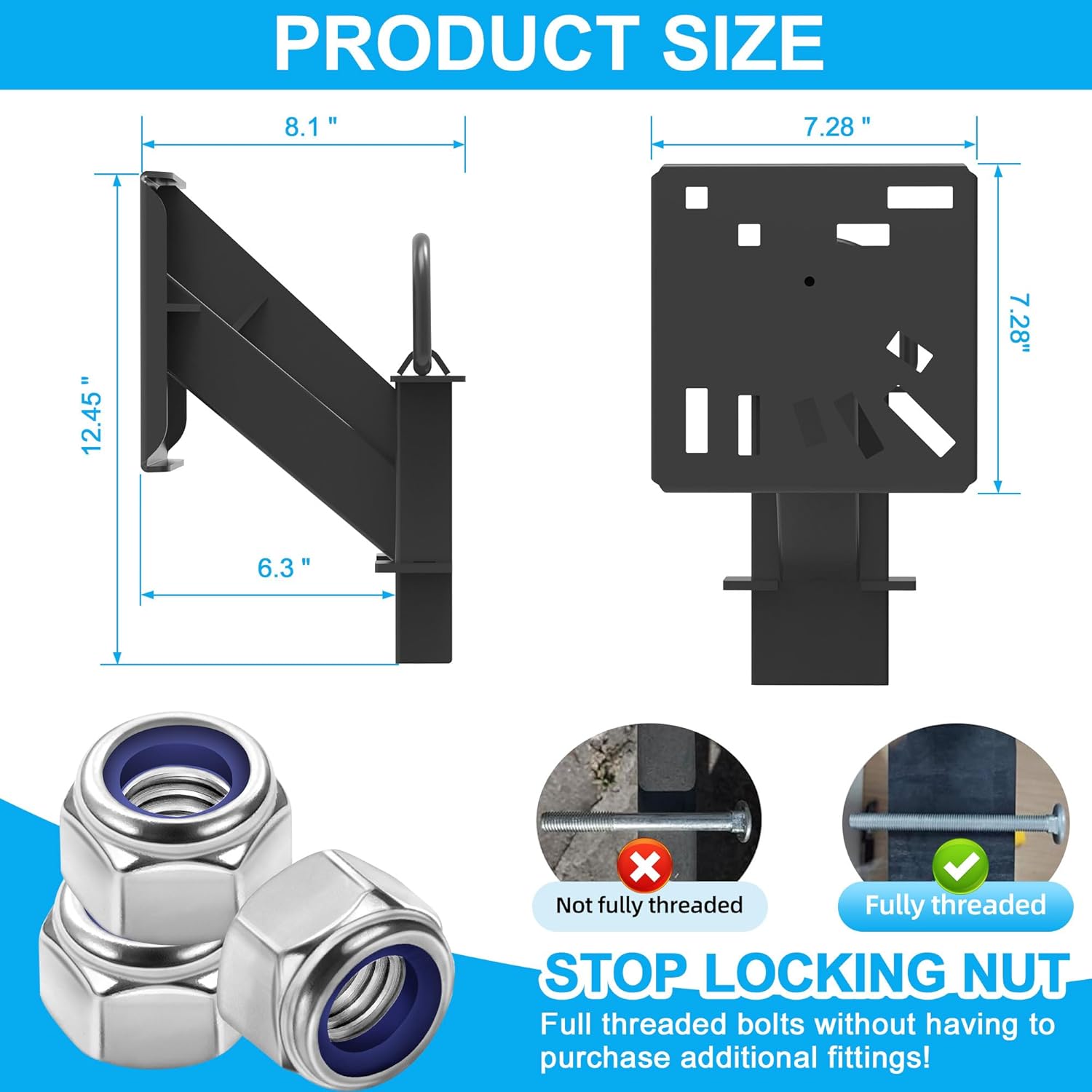 Stake pocket spare tire mount upgrade double screw fixation to prevent shaking and loosening, increase stability.Trailer spare tire mount stake pocket Fits most tongue and trailer frames Compatible with 5 Lug X 4.5" /4.75“ /5.0” , 6 Lug X 4.5"/5.32" (135mm)/5.5",and 8 Lug X 6.5"/6.7"/7.1"/7.9"(165/170/180/200mm) Diameter Hole (Patent Pending),spare tire carrier fits mounts on trailer tongues up to 4 inch wide and 2.5 to 4 inch high stake pockets.Spare tire mount for utility trailer or large truck engineering vehicle