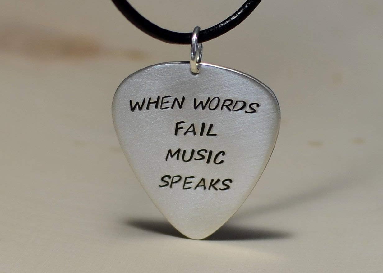 Sterling Silver Guitar Pick Necklace Handmade and stamped with When Words Fail Music Speaks