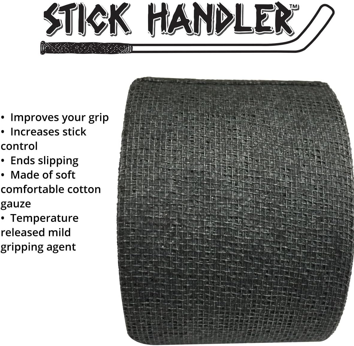STICK HANDLER Professional Hockey Grip Tape Pro Pack Improve your grip and stick control with STICK HANDLER Made in the USA of top quality surgical grade cotton gauze with a specially formulated mild gripping agent to create the ultimate custom grip. Perfect for enhancing and bulking up your handle for a custom fit and feel. To apply, wrap as desired to achieve your own personalized non-slip grip on any stick. Improves grip with no more holes in gloves or sticky build up. It sticks to itself and does not alter the natural balance of the stick and with 360 inches on each roll, there's plenty of grip tape to last stick after stick. TWO to TEN Large Rolls per package Large Roll Size: 1 1/2" inch width X 30' Feet length (8mm x 9.14m) STICK HANDLER