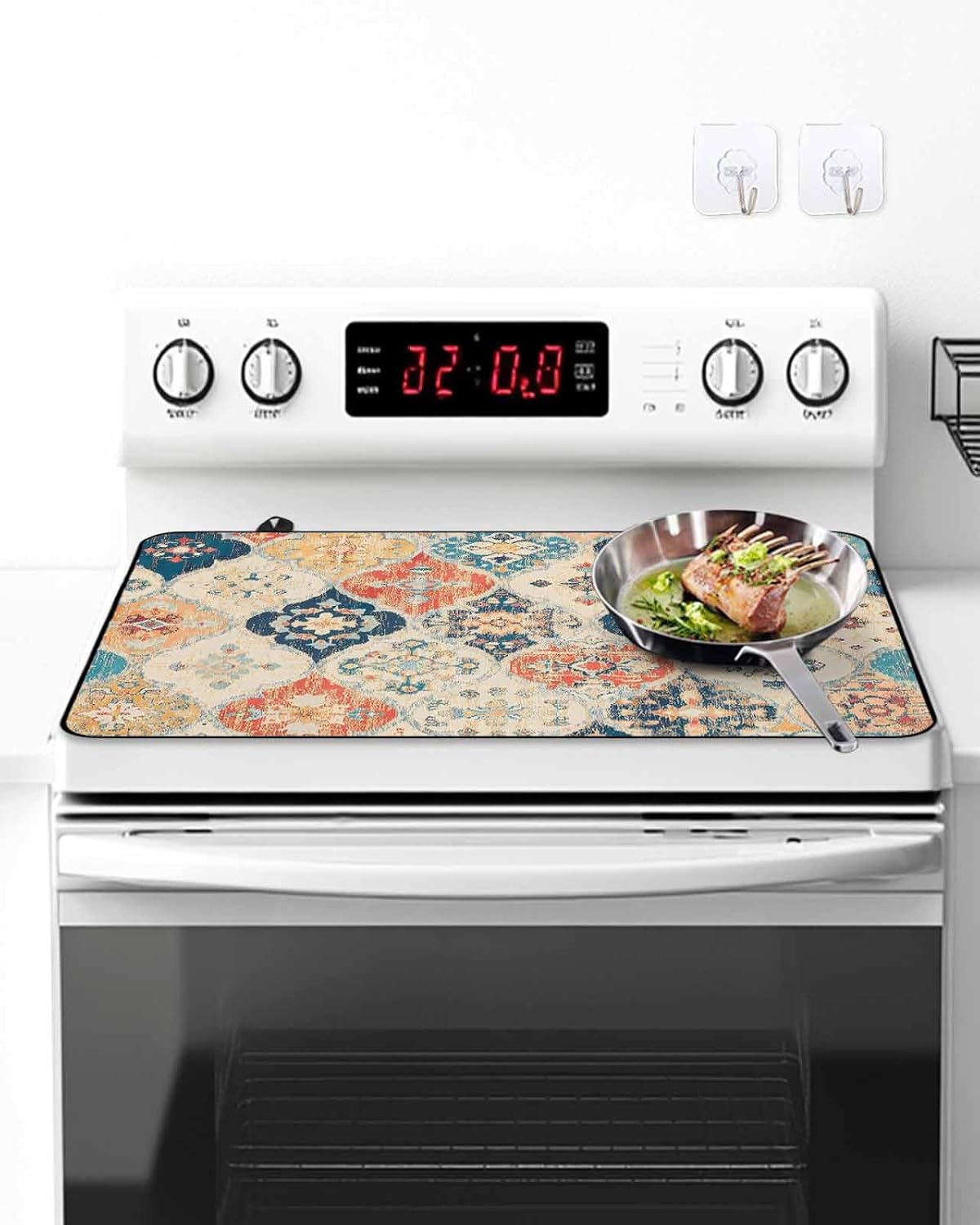 Stove Top Covers combine practicality and beauty, adding more color to your kitchen decorations.Product DescriptionMaterial: 100% Polyester cloth fabric surface with natural rubber backingSize Chart: 28.5x20.5 Inch / 24x21 Inch / 31x24 Inch / 36x21 InchExquisite WorkmanshipThe top is a layer of high-quality 100% Polyester and the bottom is rubber, which is waterproof, non slip, foldable and reusable. Will not move around when you prepare food on it.Counter Top ProtectorProtects electric, glass, or ceramic stovetop from scratches, scrapes, glass cracks, dirt & spills.Versatile UsesThe mat can be used as a stove top cover, counter top mat, ironing mat, washer top cover, coffee mat, flat top oven cover, dryer top cover, oven cover, refrigerator top cover, extra large rubber mat.Extra Counter SpaceThis stovetop cover is a one-stop solution for your many uses. It provides more worktop space for anything from food preparation to ironing. Therefore, this cooktop cover mat is perfect for kitchens with limited space.Ideal GiftThe exquisite pattern design makes the stove cover a perfect gift given to family friends and lovers. It adds color to your kitchen docor.Foldable and Easy StorageOur stove cover can be folded or rolled up and put away in your cabinet or cupboard when not in use.Special NoteNote: The mat may have creases from folding during shipping. This will smooth out in a couple of days.The colors may have slight differences due to different screens.