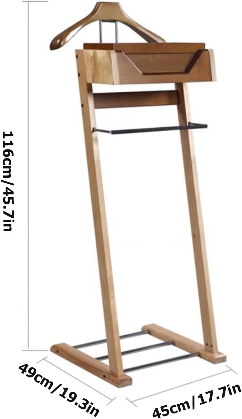 This suit stand is an exquisite piece of furniture that epitomizes style and sophistication, featuring a wood-finish veneer that enhances its elegant temperament. The superb craftsmanship and contemporary design complement each other perfectly, eloquently embodying the product's premium value, making it an indispensable and graceful addition to any home or office space.【Features】1. Contour HangerProvides a safe and elegant way to hang jackets, suits, jackets, and shirts.2. Wooden BaseThe wooden base provides ample space for storing and organizing shoes.3. Top TrayThe spacious top tray is perfect for storing and organizing small personal items.【Attention】Size: The size data measured manually, there may be 1-2 cm deviation.About Color Difference: Due to the light and angle and other factors, the image may produce color difference, the actual color should prevail in kind.【SERVICE】If there is anything unclear about the product, please feel free to contact us by email, we will solve your confusion within 24 hours.