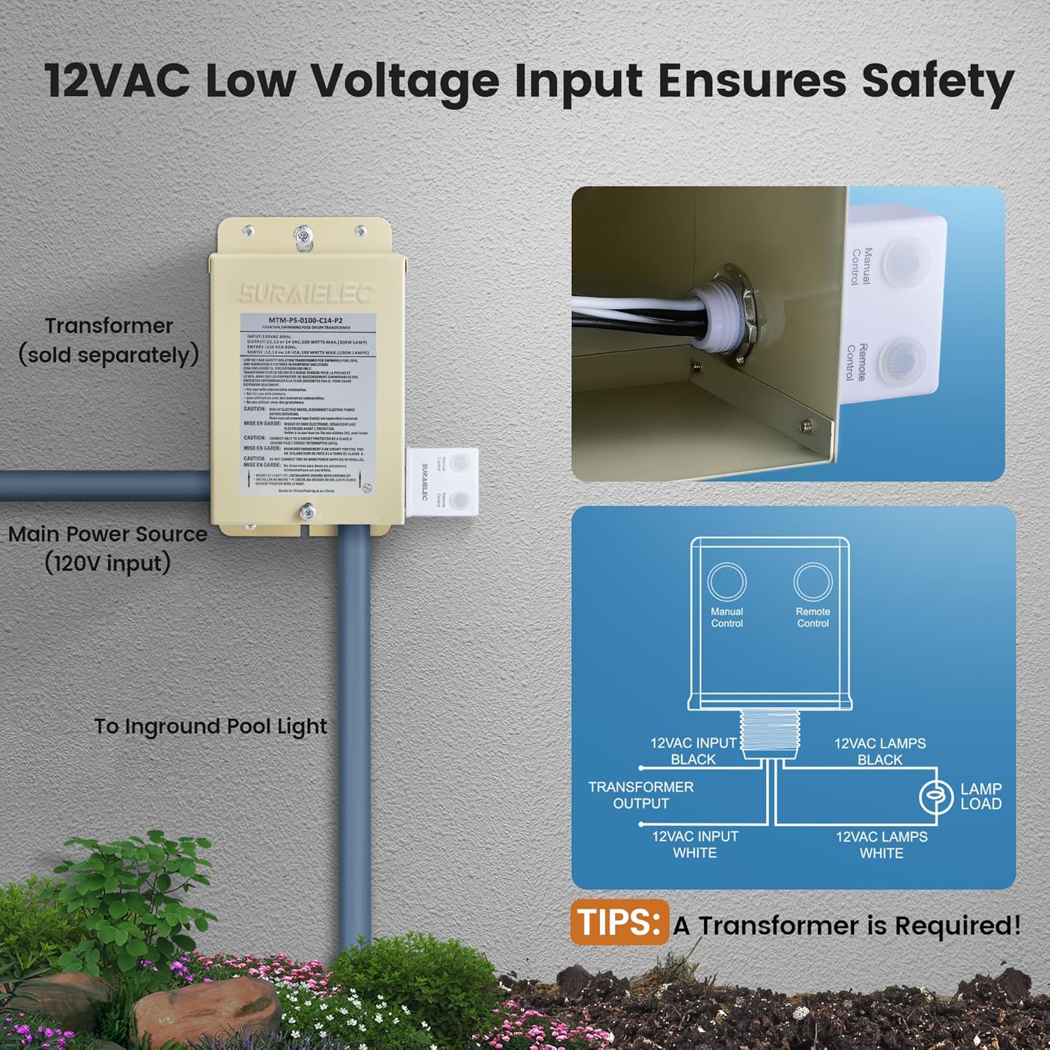 | Included Components | 1x 12V AC LED Pool Light with 50 Feet Cord; 1x Remote Control( Battery included)/ 1x Receiver/ 1xScrew/ 4x Wire Nut |