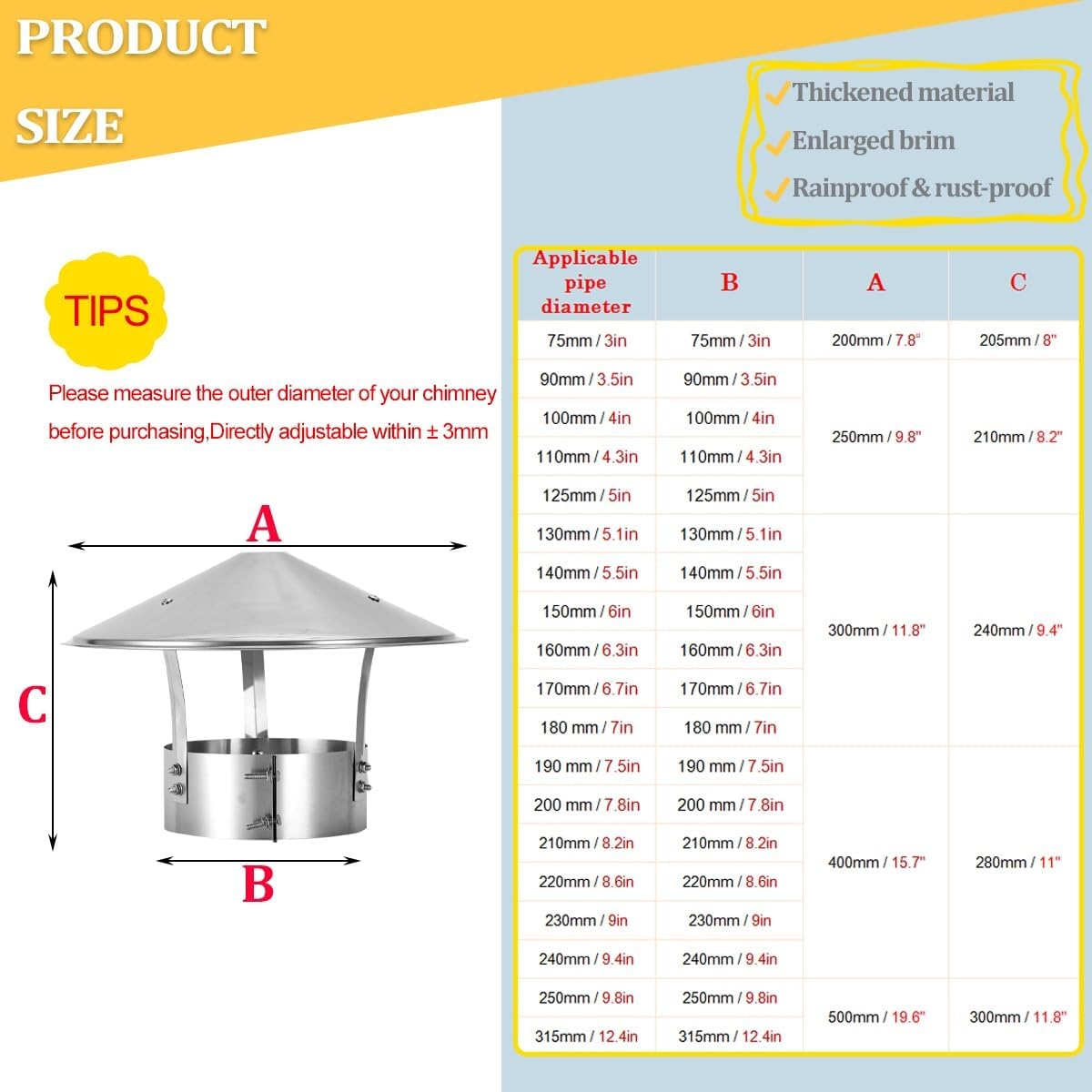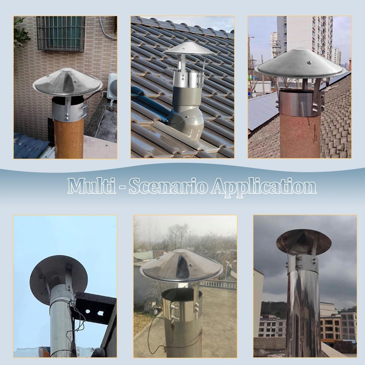 Premium 304 Stainless Steel Umbrella Chimney Cap: Ultimate Protection for Your Chimney, Fireplace & Wood Stove**Premium 304 Stainless Steel Construction**Crafted with industrial-grade 304 stainless steel, this umbrella chimney cap delivers exceptional durability against extreme weather conditions. Its smooth surface resists surface degradation while maintaining structural integrity through seasonal changes. **Umbrella-shape Design** Features a sloped profile that: Deflects rain/snow from chimney openings Allows continuous smoke ventilation Prevents bird nesting & debris accumulation Maintains optimal airflow for combustion systems **Compatibility** Perfect for: - Brick/metal chimney flues - Wood stove pipe terminals - Fireplace exhaust outlets - Roof vent pipe protection - Outdoor heating equipment **13 Precise Size Options** 75mm/3in , 90mm/3.5in , 100mm/4in , 110mm/4.3in , 125mm/5in , 130mm/5.1in , 140mm/5.5in , 150mm/6in , 160mm/6.3in , 170mm/6.7in , 180 mm/7in , 190 mm/7.5in , 200 mm/7.8in**Package Contents** 1x 304 stainless steel chimney cap