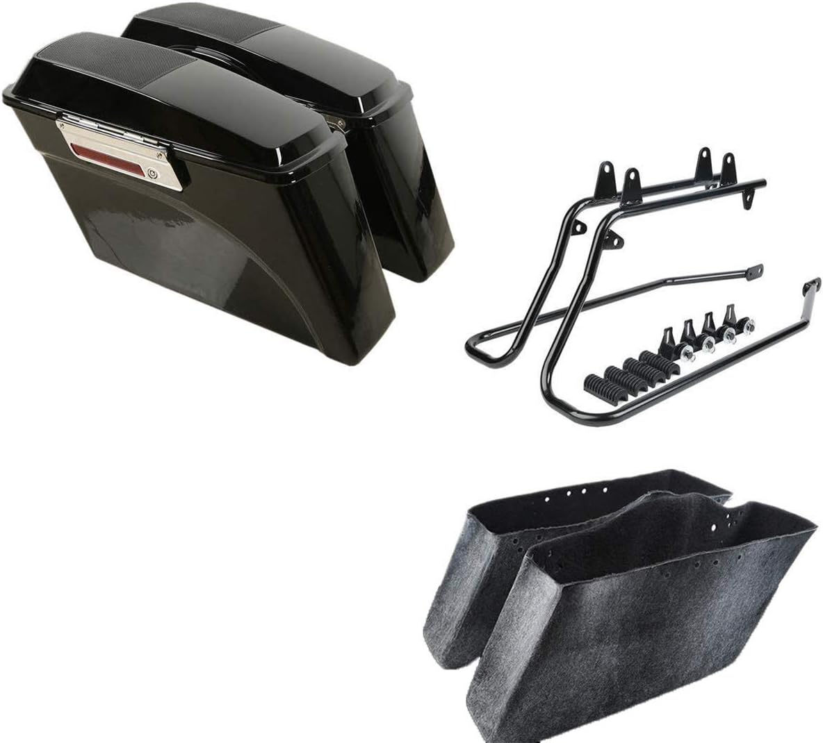 Aftermarket 100% Brand New No adjustments need, Easy to install back on original position No install instructions. Hard Saddlebags Feature: Color: Vivid Black ( painted ) Material: Very High Quality ABS Strong and smooth surfaces Saddlebags are stretched 5" longer than stock to cover the muffler front to back and give that stretched look Conversion Kit Feature: Four rubber bottom supports Black finishes mounting hardware Color: Black Size: As the Picture Show Exhaust must sit below your rear axle Turn signal relocation IS required (excludes Deluxe models) FITMENTS: Fit For 1986-2017 Harley Softail models (except softail slim, softail deuce models)