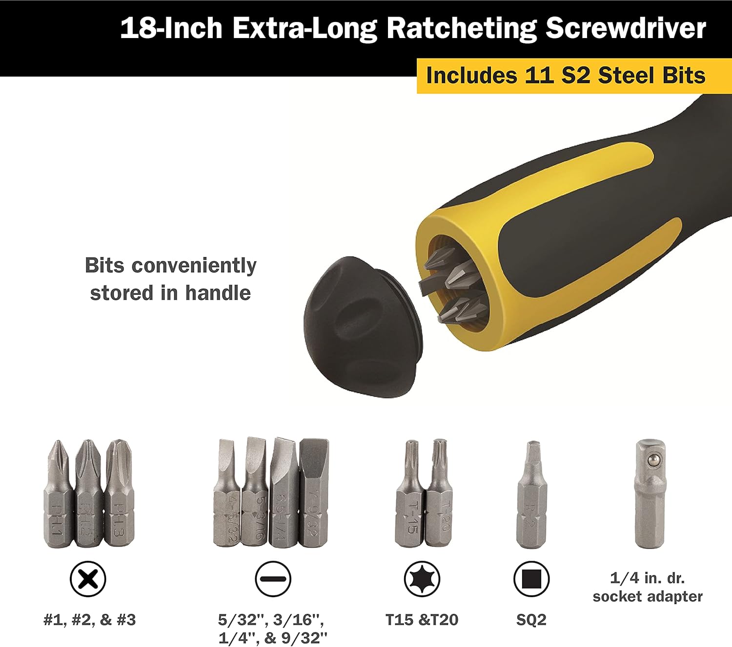 Titan 12218 12-Piece 18-Inch High-Torque Ratcheting Bit Driver includes (4) Slotted bits, (3) Phillips bits, (2) Star bits, (1) Square bit, and (1) 1-1/4-Inch socket adapter. Slotted bit sizes include 5/32, 3/16, 1/4, and 9/32-Inch. Phillips bit sizes include #1, #2, and #3. Star bit sizes include T15 and T20. Square bit size is SQ2. Overall length is 18-Inches. Shaft is constructed of stainless steel and bits of S2 steel. High-torque for maximum utility. Bit storage is conveniently located in handle. Screwdriver features a reversible ratcheting design and magnetic bit holder. Made in Taiwan.