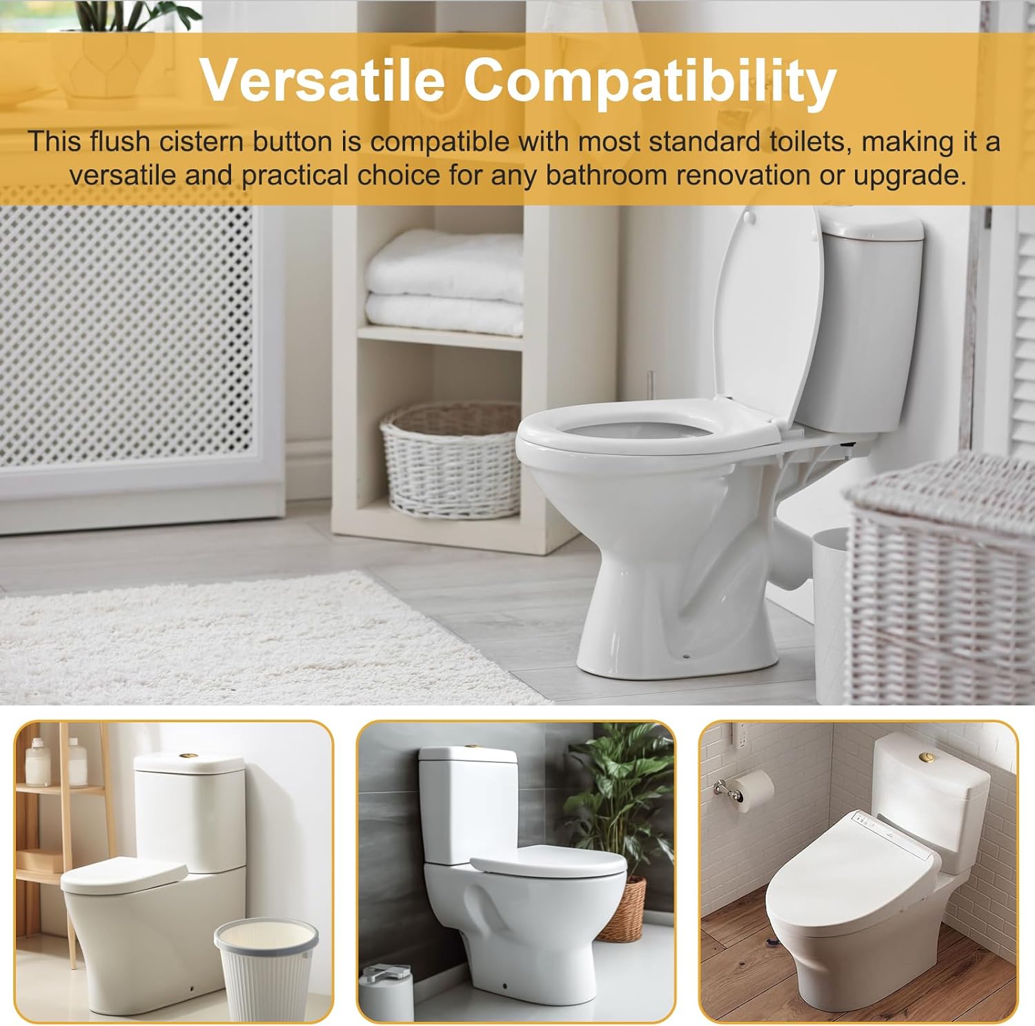 Features:* Elegant Design: The brushed brass gold finish adds a touch of sophistication to your bathroom decor, while the flush cistern button features a sleek and modern design.* Construction: Made from high-quality materials, this flush cistern button is built to last. The 38mm size ensures smooth and reliable flushing every time.* Easy to Install: The close coupled design allows for easy installation, making it convenient for both DIY enthusiasts and professional plumbers.* Precise Flushing: With a simple press of the button, this flush cistern ensures a powerful and efficient flush, effectively clearing the waste and maintaining hygiene.* Versatile Compatibility: This flush cistern button is compatible with most standard toilets, making it a versatile and practical choice for any bathroom renovation or upgrade.Specifications:*Product Name:Brushed Brass Gold Toilet Flush Cistern Button Close Coupled 38mm*Material:ABS*Size:38mm*Color:Brushed Brass GoldPackage Content:1 toilet button