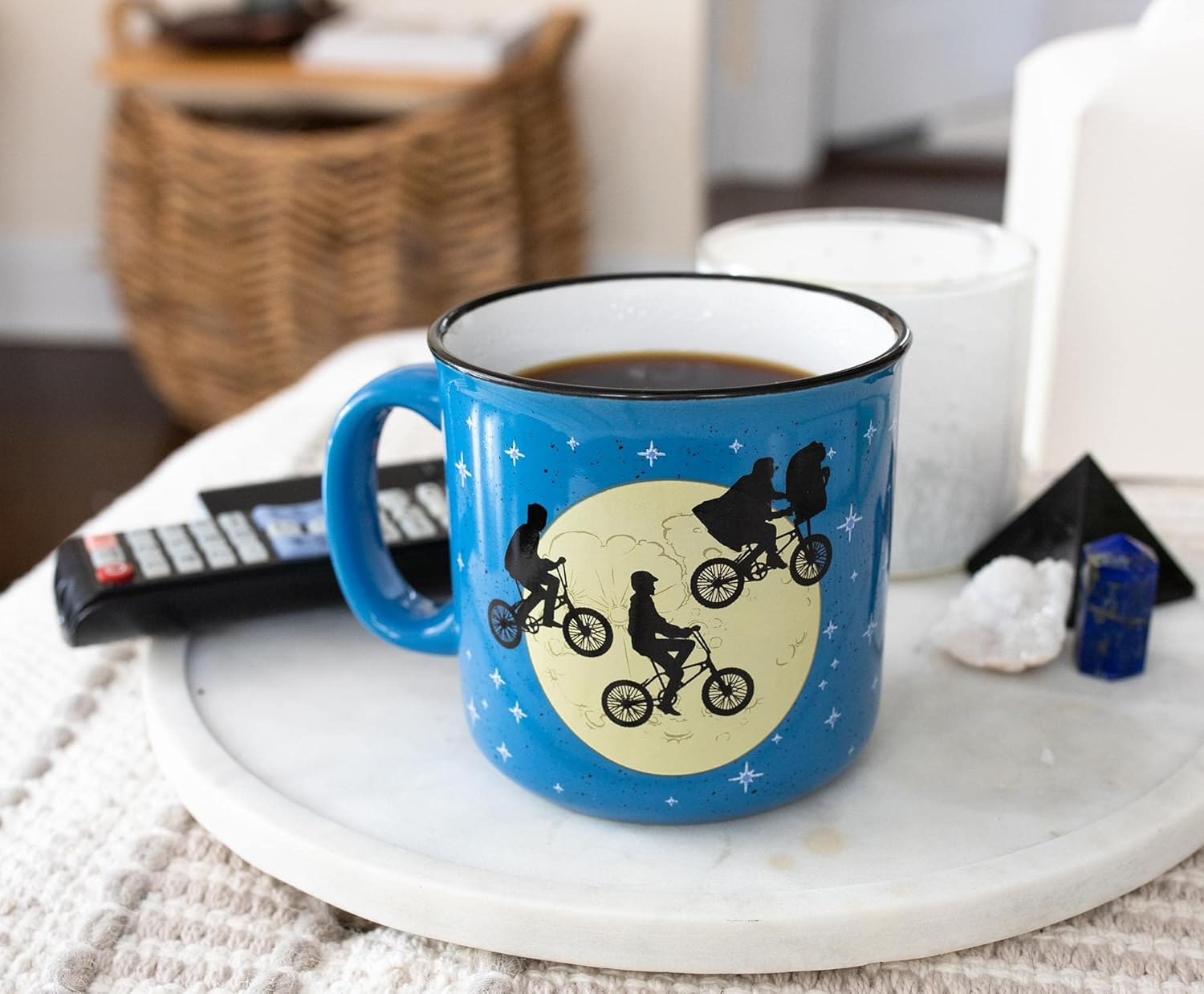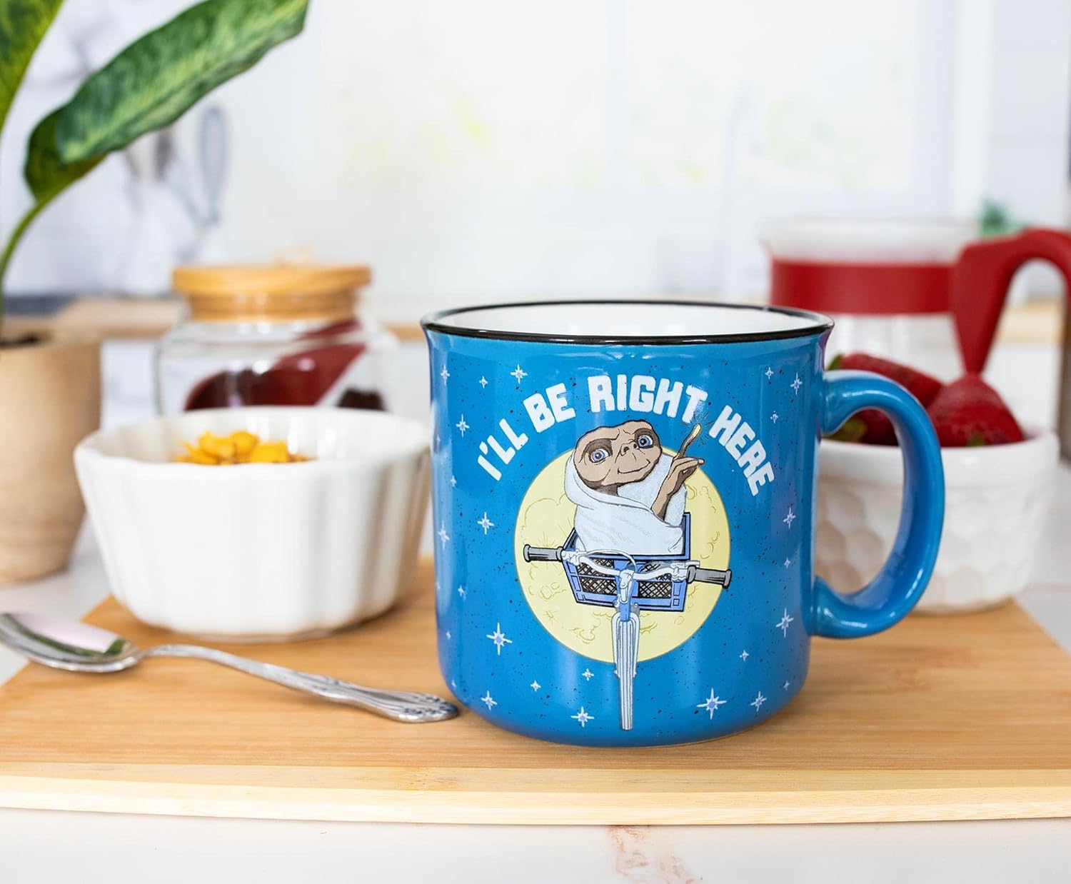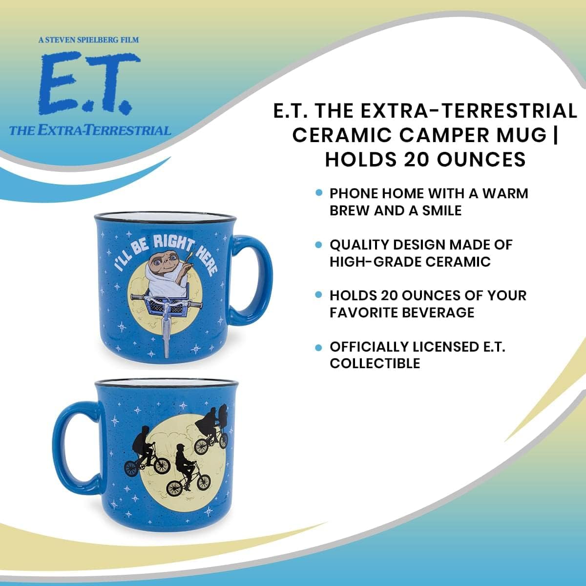 E.T. PHONE HOME Relive one of the most iconic scenes from Steven Spielberg's E.T. the Extra-Terrestrial with this exclusive coffee mug. One side features E.T. tucked in a bike basket and using his telekinesis to soar across a moonlit sky. The heartwarming line "I'll Be Right Here" curves around the top of the graphic. The opposite side features a silhouette of Elliot and his friends flying on their bicycles to evade authorities. The speckled camper mug features starry elements with a glossy blue finish and a black rim. REFRESHMENTS FROM YOUR HOME PLANET Befriend a visitor from another world over a warm brew. Not even gravity can hold you down with this ceramic mug in hand that brings a little nostalgia to every sip. Perhaps you prefer something a little sweeter to the taste of coffee. Dump a bag of peanut butter candies and treats inside the mug to satisfy your sweet tooth. (We hear it's a favorite among Brodo Asogians.) Let your imagination take flight with this officially licensed collectible from E.T. the Extra-Terrestrial. CARE INSTRUCTIONS Easy care Top-rack dishwasher safe Microwave safe