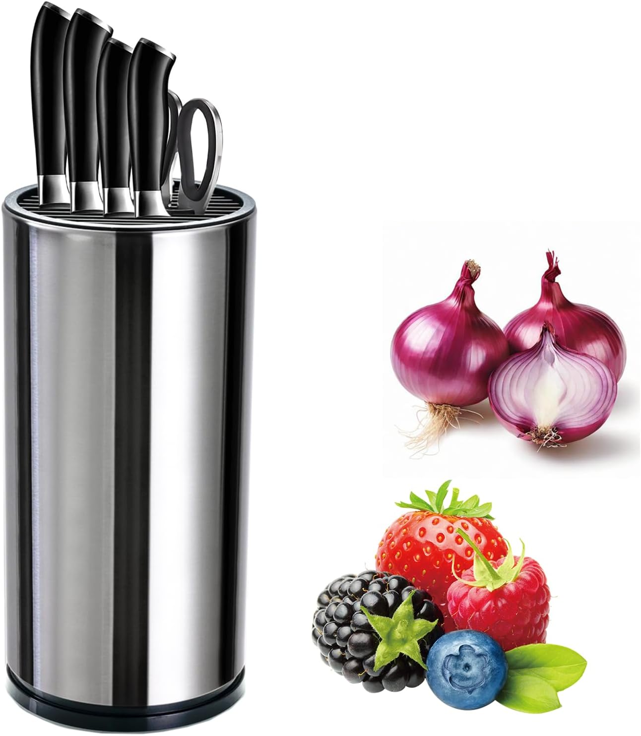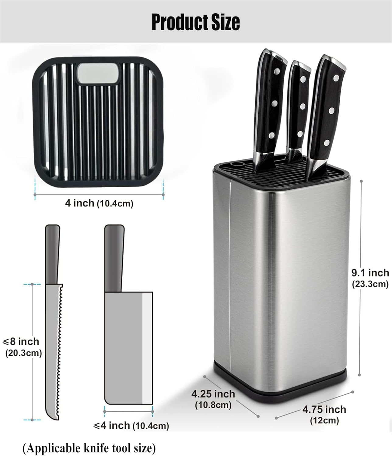 Specification: Size:about 9.5x9.5x23.5cm Material:stainless steel and plastic Detachable Design: Detachable design allows you to easily clean this knife block organizer. Drain Hole: Drain hole in the bottom allows water from knives to drain off, prevents rust and easy to dry. SIZE: It’s important to ensure that your most frequently used knives will fit into the slots of the knife block, so measure the size of your knives before choosing a knife block. This Universal Knife Block sports a slotless design so that all knives with blades up to 8” long will fit easily into the block. In fact, it easily holds up to 12 knives!