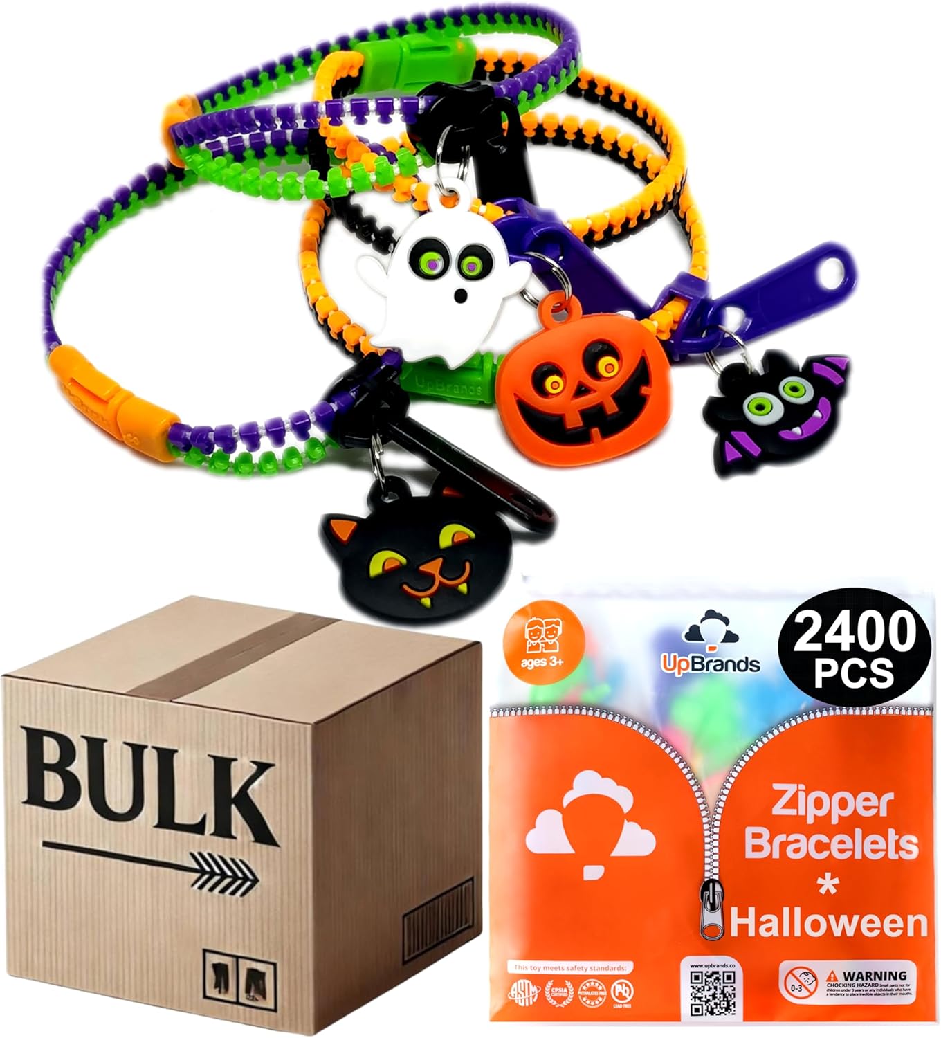 | Included Components | 120 Halloween Zipper Bracelet + Rubber Pendants, 120 Pack - Halloween Fidget Zipper Bracelets Sensory Toys:, 60 ORG-BLK bands, GRN clasps, PURP puller, 60 PURP-GRN bands, ORG clasps, BLK pull, ORANGE Pumpkin - BLACK Cat |