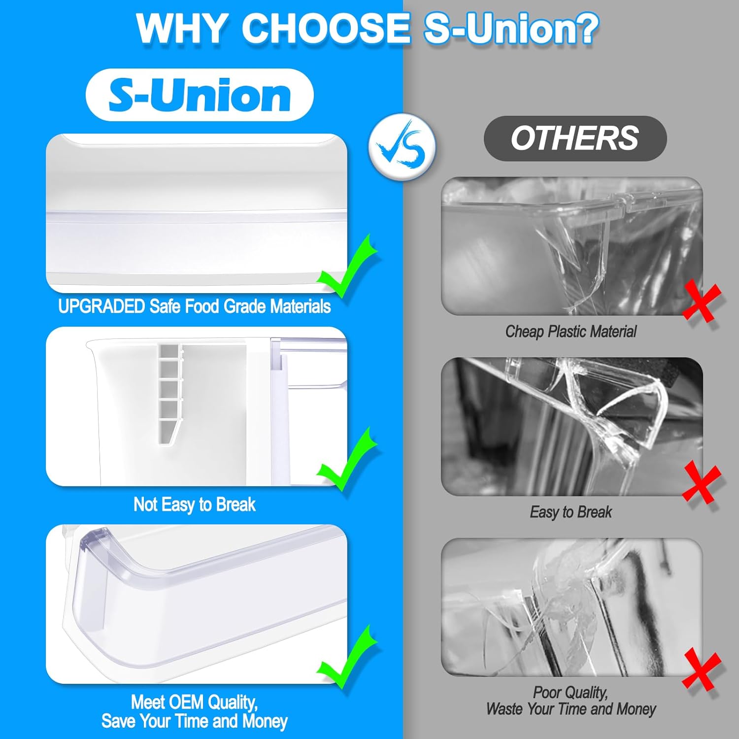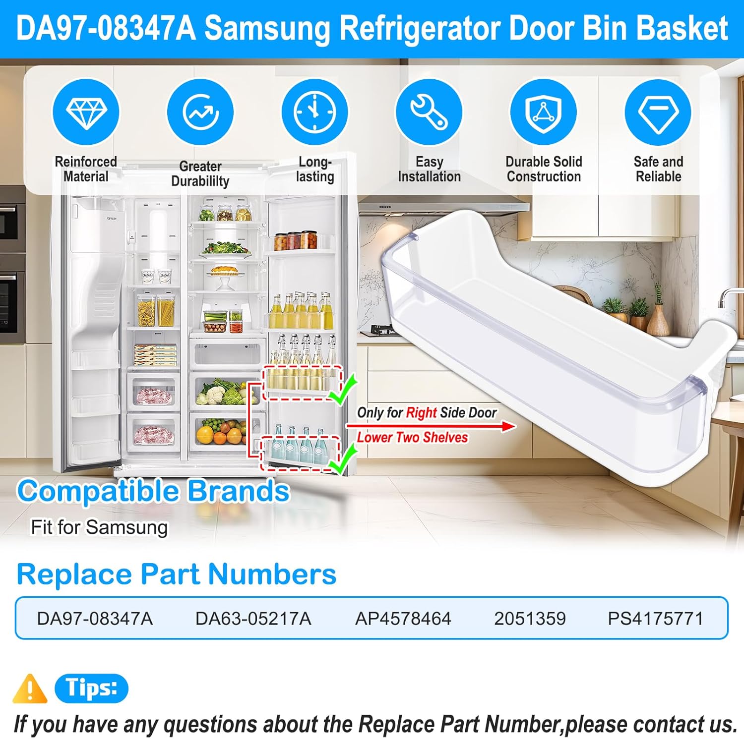 | Material | DA97-08347A refrigerator door shelf basket bins for samsung are made with food-grade eco-friendly materials, which is safety, hygiene and durability. Featured with light weight, good toughness, high-density and no breakage. The fridge bin are tested by manufacturer to match and/or exceed specifications of OEM products. In addition, it is easy to install.If your refrigerator door bin is cracked, damaged, or missing, you can replace it by this DA97-08347A door shelf part. |