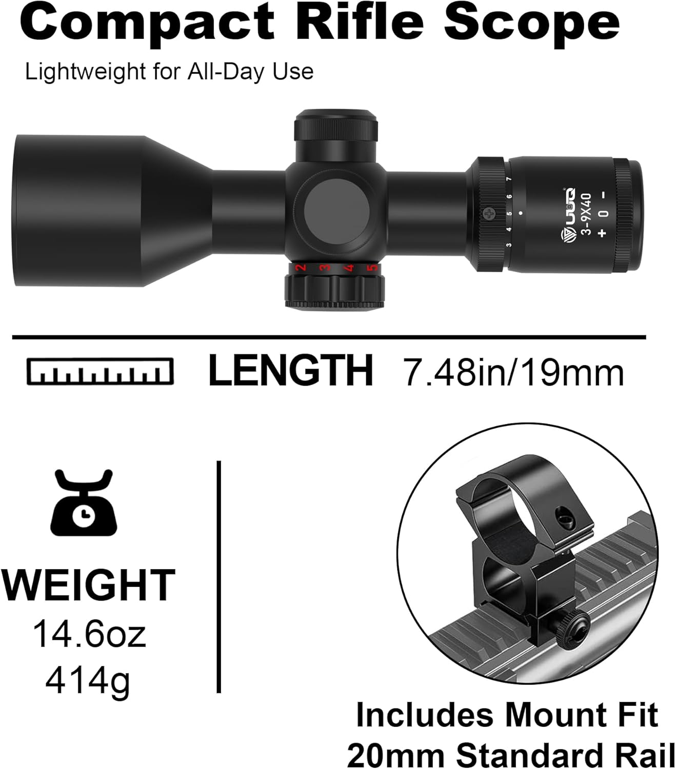 UUQ 3-9x40 Compact Rifle Scope,Red/Green Illuminated Crosshair Reticle, Extended Eye Relief,Parallax Correction & Fast Focus | Lightweight & Water-Resistant | Fits 20mm Picatinny/Weaver Rail