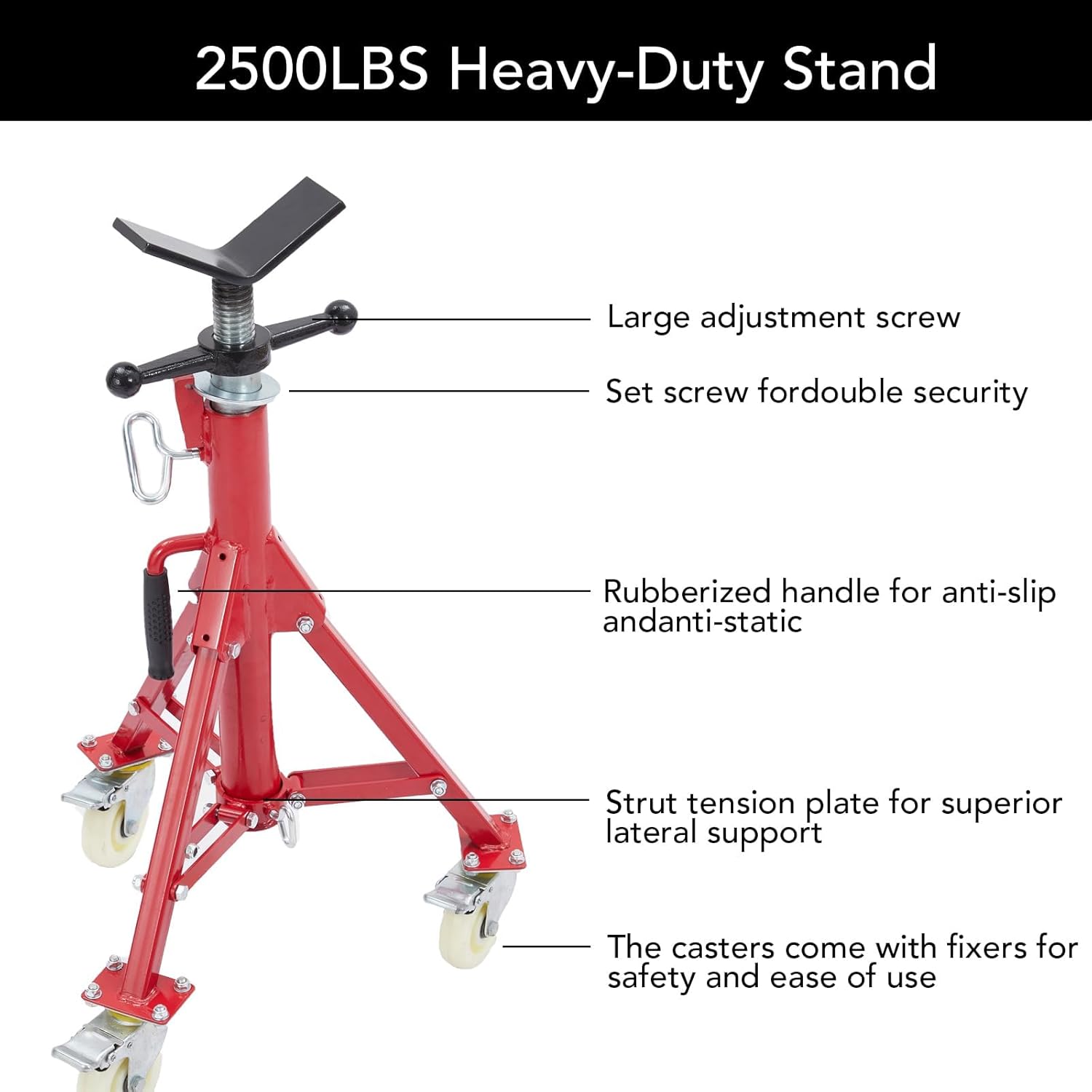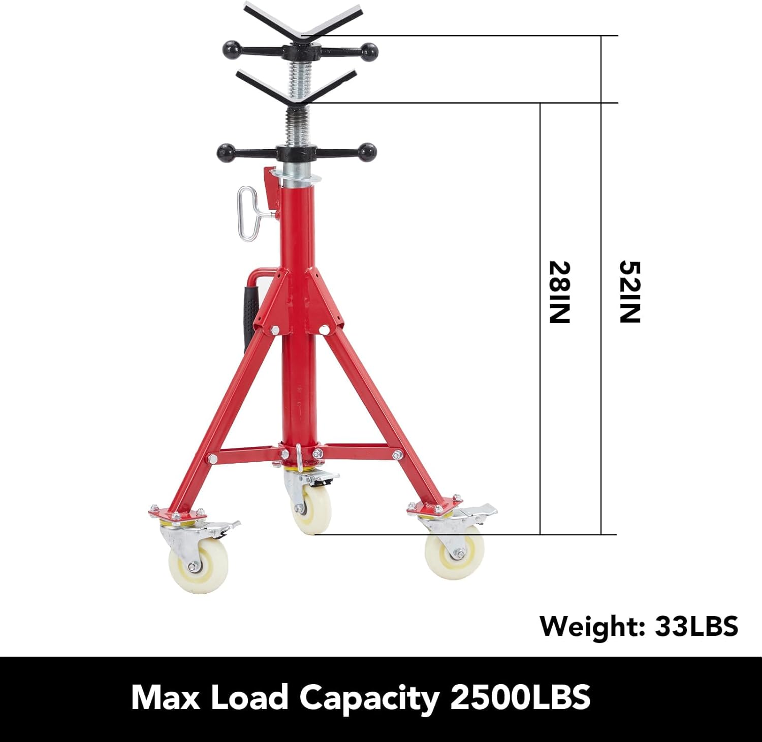 Heavy Duty V-Head Pipe Jack Stand – Adjustable, Foldable, 2500 LB Capacity with CastersStruggling to keep pipes steady and perfectly positioned during your welding or construction projects? Imagine having a heavy duty pipe stand that adjusts to your ideal height, rolls smoothly into place, and locks securely so you can work with total confidence. What if setup, storage, and transport were just as effortless—thanks to a foldable design and a comfortable carry handle? Ready to take your workflow to the next level with stability, strength, and versatility on every job? Scroll down to see how these V-head pipe jack stands can transform your workshop experience!Specification:Material: MetalHeight Adjustable: 28-52 inSupport Pipe Size: 1/8-12 inColor: RedFriendly Note:Do not exceed the maximum load bearing specified in the product manual to avoid accident or damage.Always place the jack stand on a stable, flat, and non-slippery surface to ensure optimal performance and safety.Store the jack stand in a dry environment to prevent rust or corrosion, and keep out of reach of children.Always wear proper safety gear such as gloves and goggles when using the jack stand.