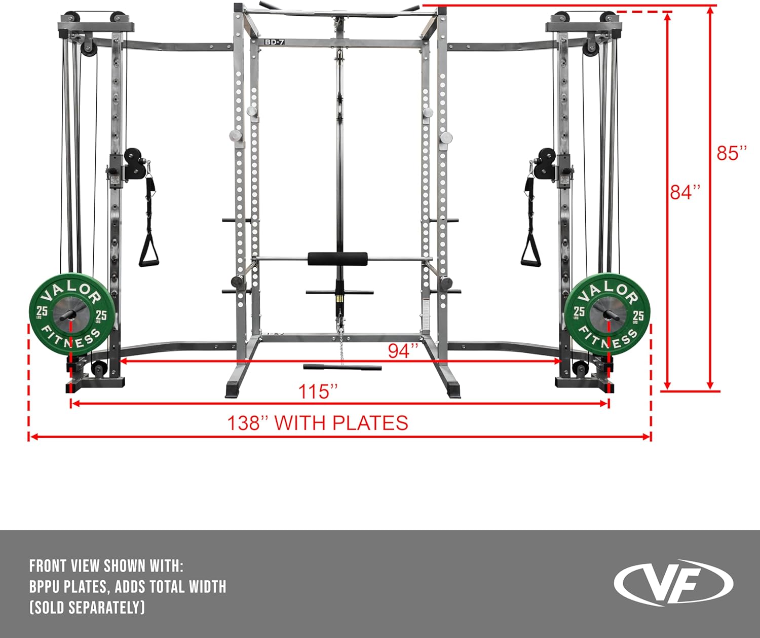 | Included Components | Valor Fitness Power Rack with LAT Pull & Cable Crossover Attachments |