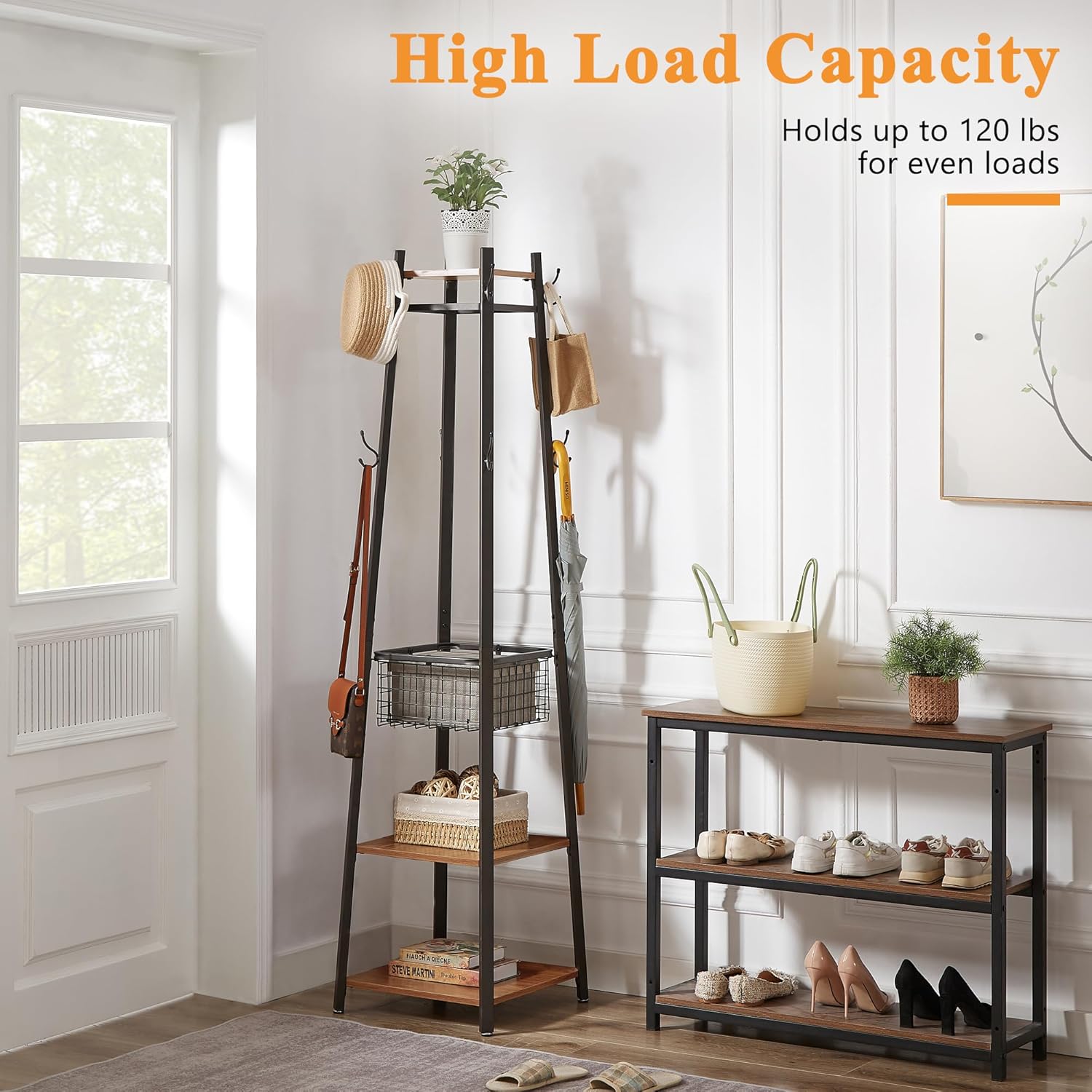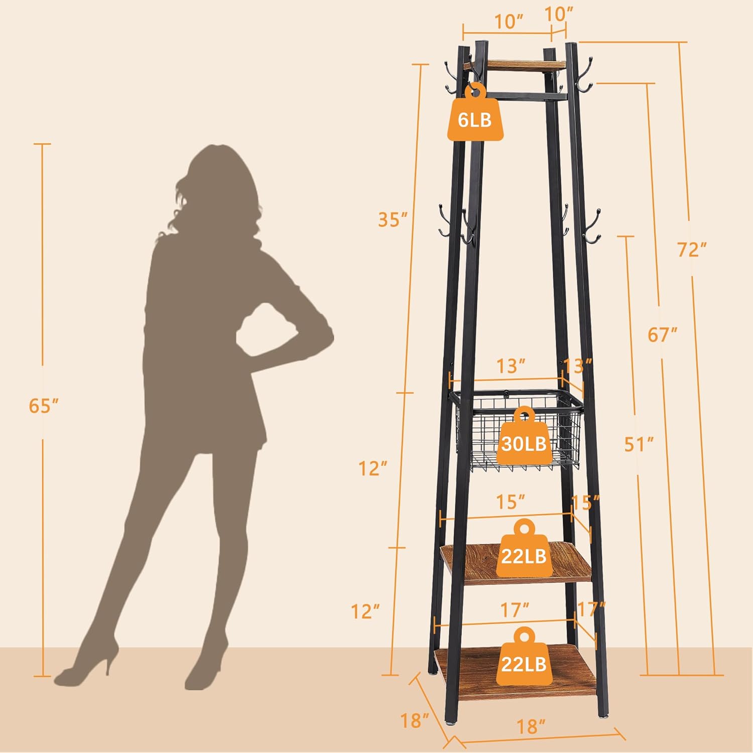 VECELO Vintage Coat Rack:1-Year Qualtity Guarantee3-Tier Wooden Shelves for Storage8 Dual Hooks for Jackets,Hats, T-shirtsStable Quadrangular Structure and Adjustable feet for BalanceUnique Metal Storage Basket You Never Find in Other Coat RacksSpecifications:Material: MDF+MetalSize: 17.72"L x 17.72"W x71.26"H (45 x 45 x 181 cm)Weight: 31.35 lb ( 14.42kg)Max. Static Load Capacity: 22 lb/tier (10 kg)Max. Hook Load Capacity: 6 lb (2.7 kg)Max. Basket Load Capacity: 30 lb (13.6 kg)Package Contents:1 x Coat Rack1 x Bag of Fittings1 x InstructionsVECELO Notes:The product is intended for indoor use only. Only place it in a dry area.Do not put overweight items on it.