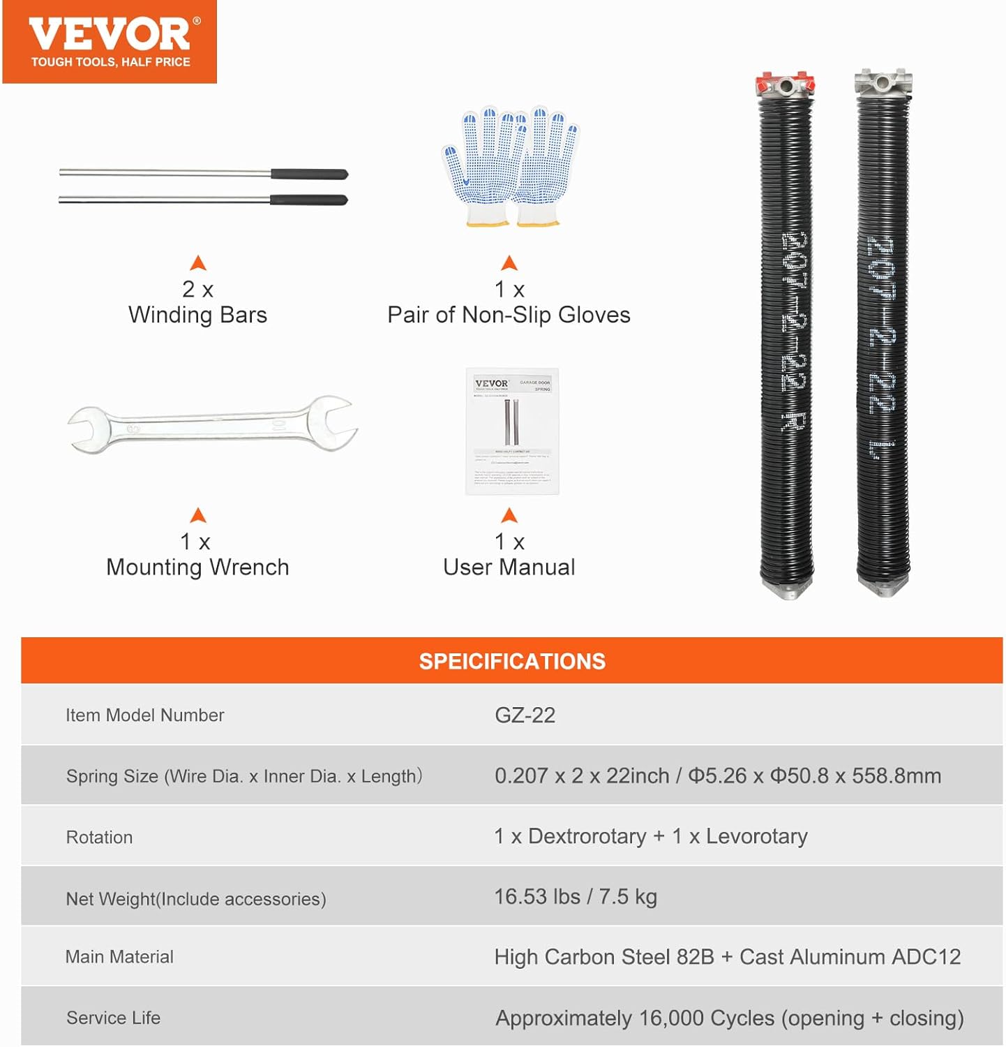| Included Components | 1 x Mounting Wrench, 1 x Pair of Non-Slip Gloves, 1 x User Manual, 2 x Garage Door Springs, 2 x Winding Bars |