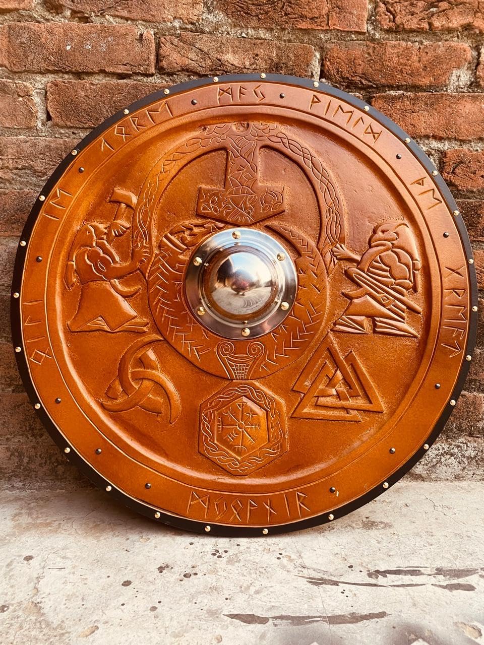 Transport yourself to the age of Norse mythology with this stunning Viking shield, masterfully crafted with intricate leather work and traditional Nordic designs. The shield features beautifully embossed mythological scenes and authentic runic inscriptions around its circumference, complemented by a polished metal boss at its center. The rich tan leather covering displays detailed Celtic knotwork patterns, Valknut symbols, and other ancient Norse motifs that tell stories of the Viking age. This decorative shield measures approximately 36 inches in diameter and comes with a sturdy black trim adorned with metallic studs for both aesthetic appeal and reinforcement. Perfect as a statement piece for medieval enthusiasts, collectors, or anyone looking to add a touch of Nordic warrior culture to their home decor. Each shield is carefully detailed with symbolic elements that showcase the rich heritage of Viking craftsmanship and storytelling through art.