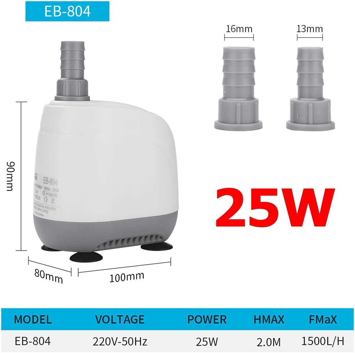 Specification:Power: 5-25W.color: blue.Cable length: 1.5m.Package Included:1 x submersible pump (excluding other items in the photo).2 x nozzles.