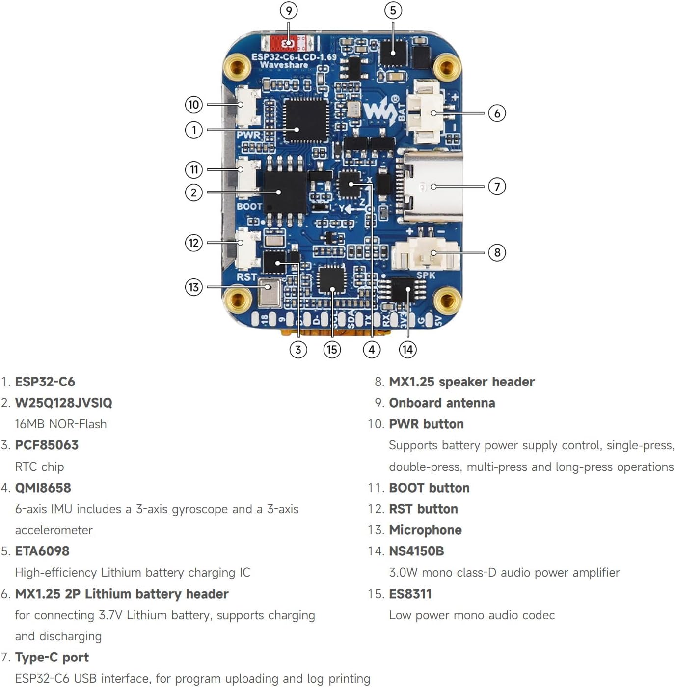 • Versatile and Portable: Designed for flexibility, the ESP32-C6 1.69-inch LCD development board is perfect for various embedded projects, including wearable devices, robotics, and AI applications. With its integrated lithium battery charging support, it ensures portability and continuous operation.