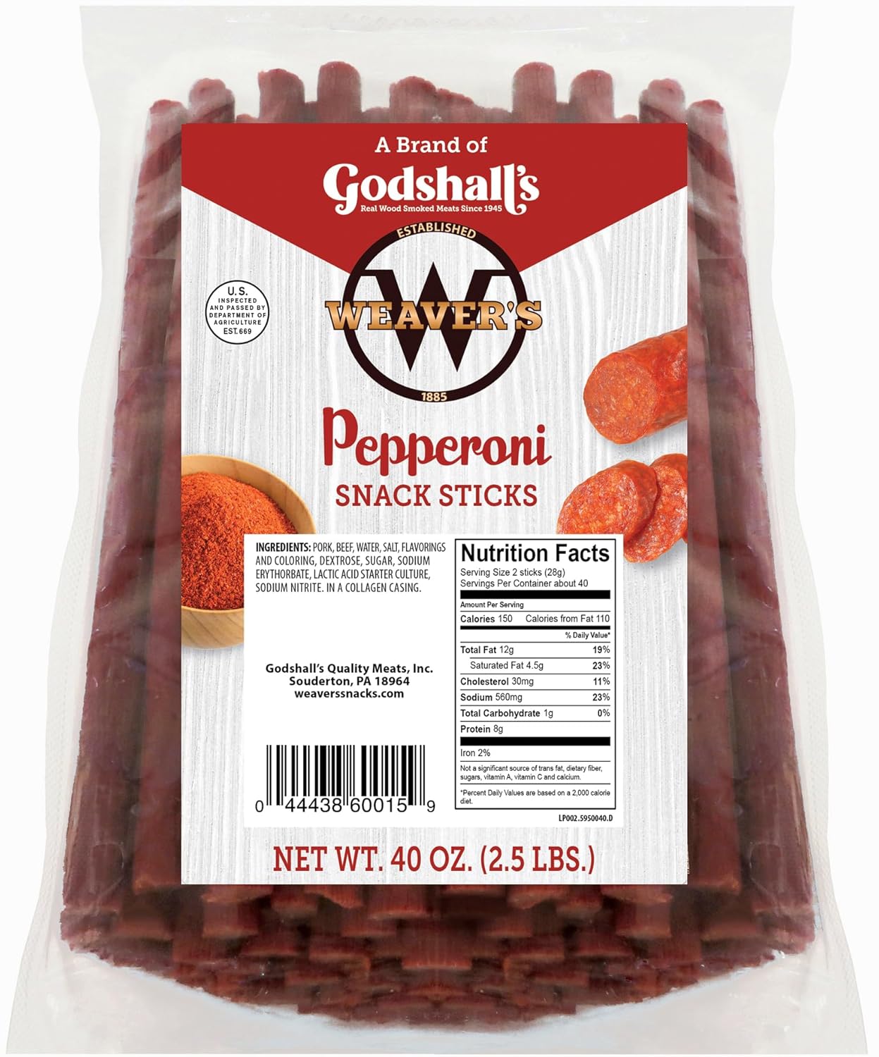 Weaver’s 7" Original Snack Sticks are made with beef and chicken and have a big meaty flavor in every bite. Each 40oz bag includes about 80 sticks. These gluten free snack sticks continue to be a customer favorite year after year. The Daniel Weaver Company has been making quality smoked meats since 1885. Their line of Weaver’s Beef Sticks and Snack Sticks are made in state-of-the-art smokehouses using real wood smoke. With well over a century of experience, The Daniel Weaver Company knows how to make meat snacks right - taste the tradition and experience for yourself.