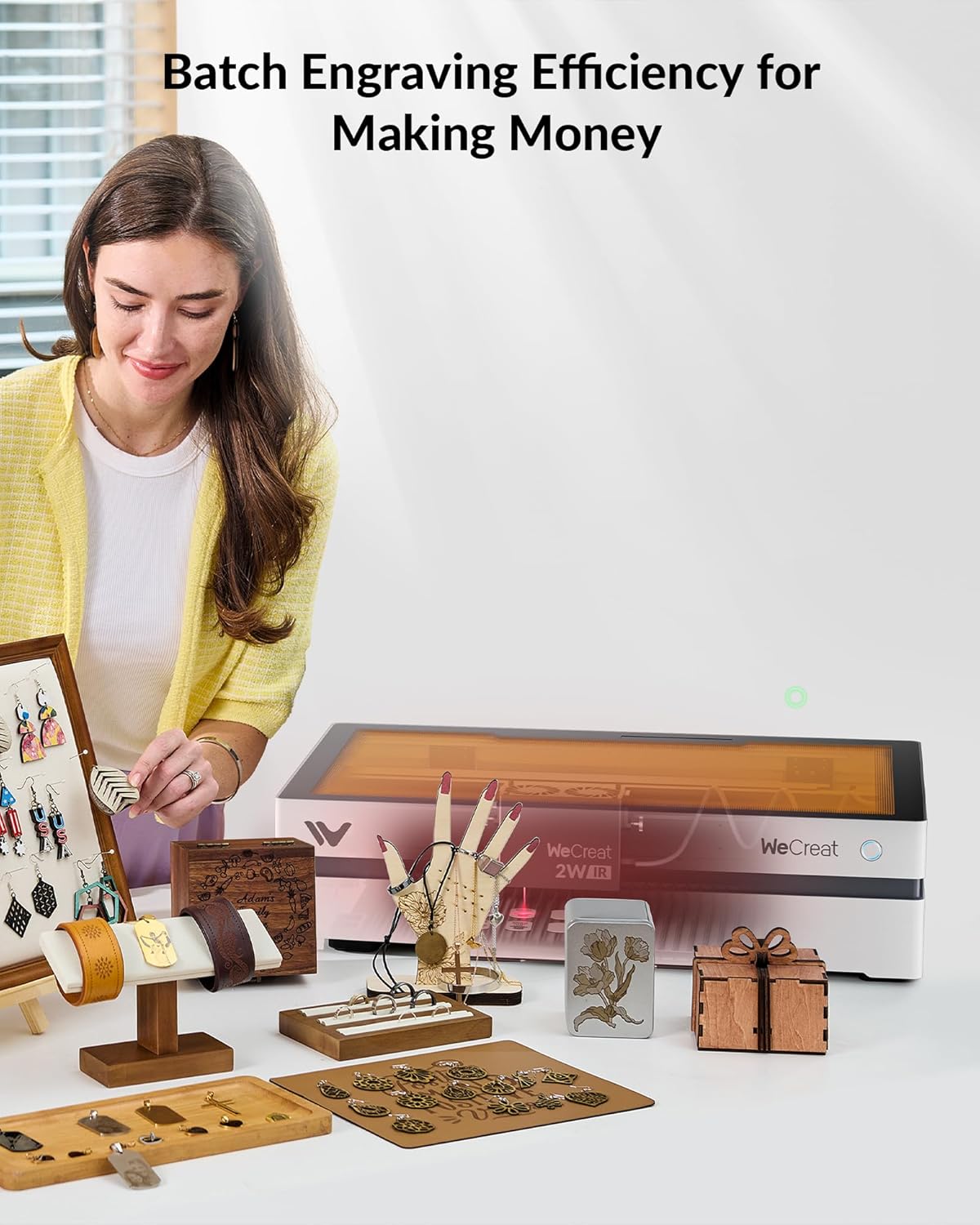 • Ultra-Precision 0.03mm Laser Spot: WeCreat 1064nm laser module is more suitable for processing finely detailed small objects. She was paired with a WeCreat Vista HD camera and 90° FlipLaser features for jewelry personalization.