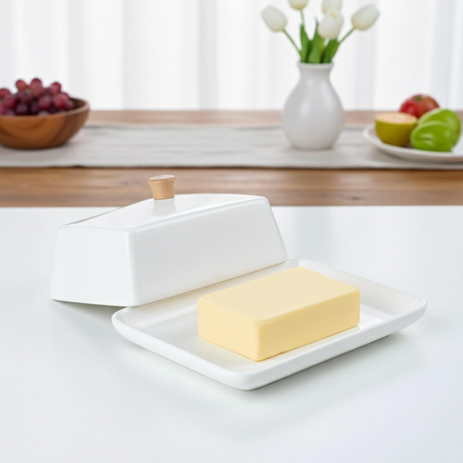 Color: White Material: Ceramic Size: Product Size: 7.1 in x 3.1 in x 5.1 in/18 cm x 8 cm x 13 cm Package Includes: 1 x Butter Dish with Lid Note: - Please refer to the measurement. Tiny measuring error is allowable in normal range. - There might be a little color difference due to the monitor, camera or other factors, please refer to the physical item.