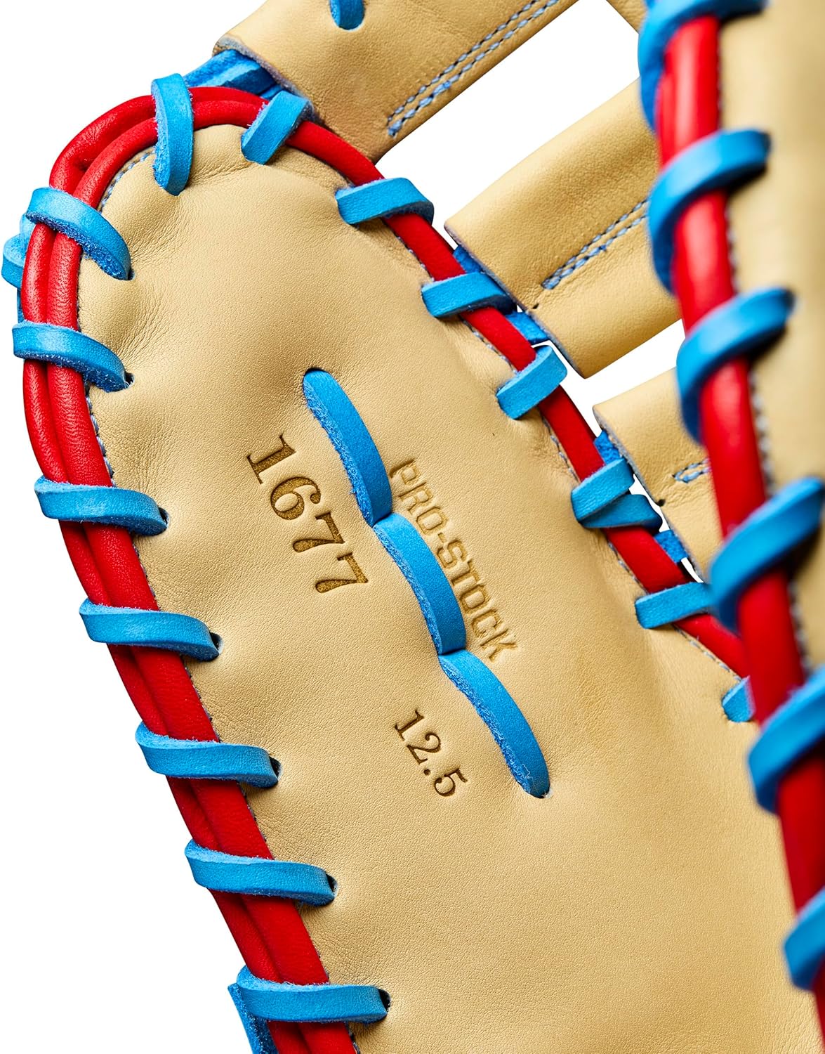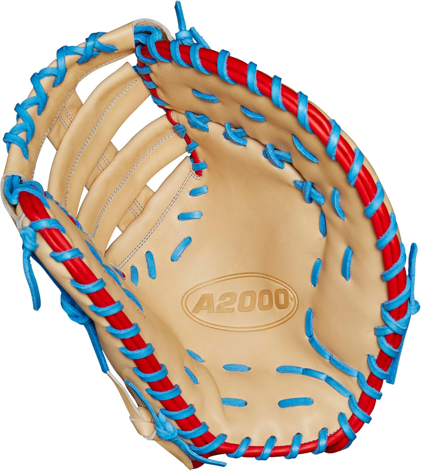 • Wilson Spring 2025 A2000 1677 12.5” Baseball First Base Mitt - Left Hand Throw, Blonde/Red/Sky Blue