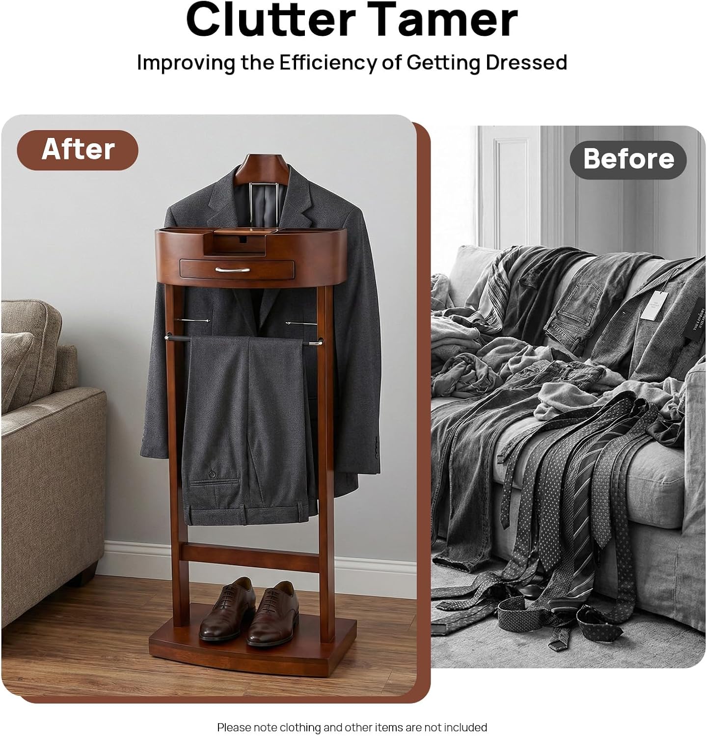ApplicationIt is used in bedrooms, living rooms, hallways, foyers, offices, and small apartments to hang items such as hats, scarves, bags, and clothes.SpecificationColor: BrownStyle: ModernMaterial: Birch, Iron Bronze, RubberProcess: Electroplating, Baking PaintLoad Capacity: 10kg/22 lbsAssembly Required: YesMounting Type: Free StandingProduct Size: 43*33.5*107cm/16.93*13.19*42.13inPackage Size: 100*35.5*13cm/39.37*13.98*5.12inGross Weight: 7.28kg/16.05 lbsNet Weight: 7kg/15.43 lbsPackage Included1* Suit Rack1* English InstructionOther Accessories for AssemblyNotes1.Please note that items such as suits and trousers are not included in this product.Please allow the slight color difference caused by the shooting light and 1-3 cm error due to manual measurement, and make sure you do not mind before ordering.
