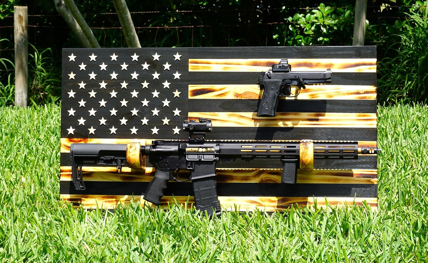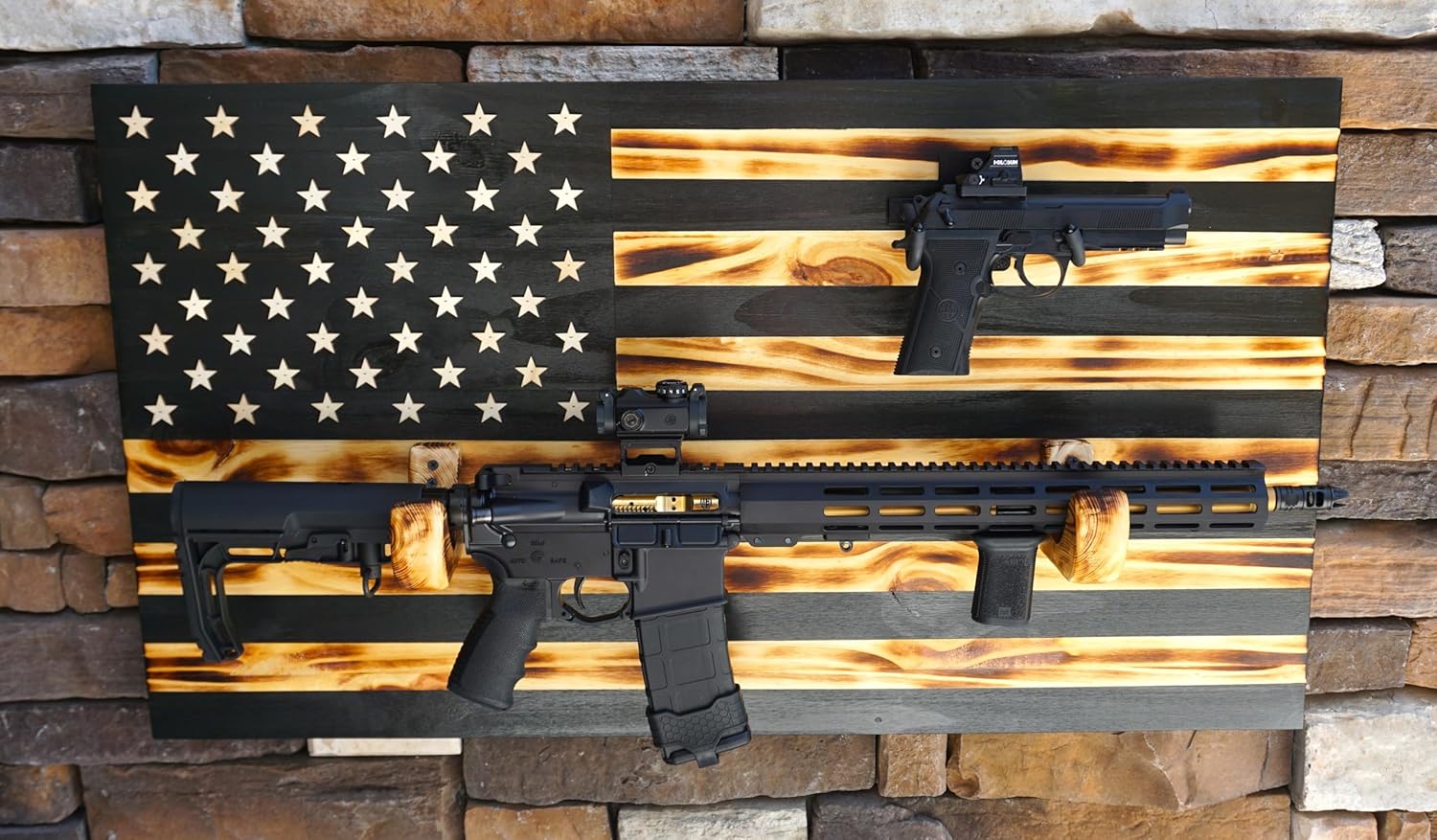HANDMADE RUSTIC WOODEN AMERICAN FLAG WITH RACKS FOR TWO GUNS 36 x 19.5 PERFECT GIFT FOR MEN, DAD, HUNTER, MILITARY MEN. MADE IN THE USA. LOOKS AMAZING IN ANY HOME DECORE. MATERIALS FIRE, STAIN, WOOD. SIZE 36 x 19.5 THE STARS ARE LASER CUT. ALL OUR FLAGS COME WITH PRE-INSTALLED SAWTOOTH HANGERS WITH SCREWS RIFLE AND PISTOLE ARE NOT INCLUDED 100% SATISFACTION GUARANTEED. US SELLER - WE ARE 100% AMERICAN OWNED COMPANY, SO OUR CUSTOMERS GET GREAT LOCAL CUSTOMER SERVICE. RIFLE AND PISTOLE ARE NOT INCLUDED